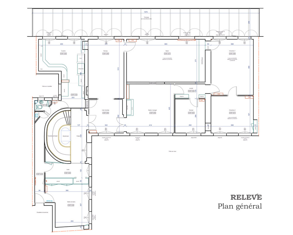 Nous vous remettons un plan précis de votre bien en l’état existant avant travaux. Il permet par exemple de connaître les surfaces exactes, les hauteurs sous plafond, les épaisseurs de mur … Il servira de base pour effectuer tous les autres plans.