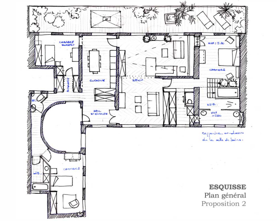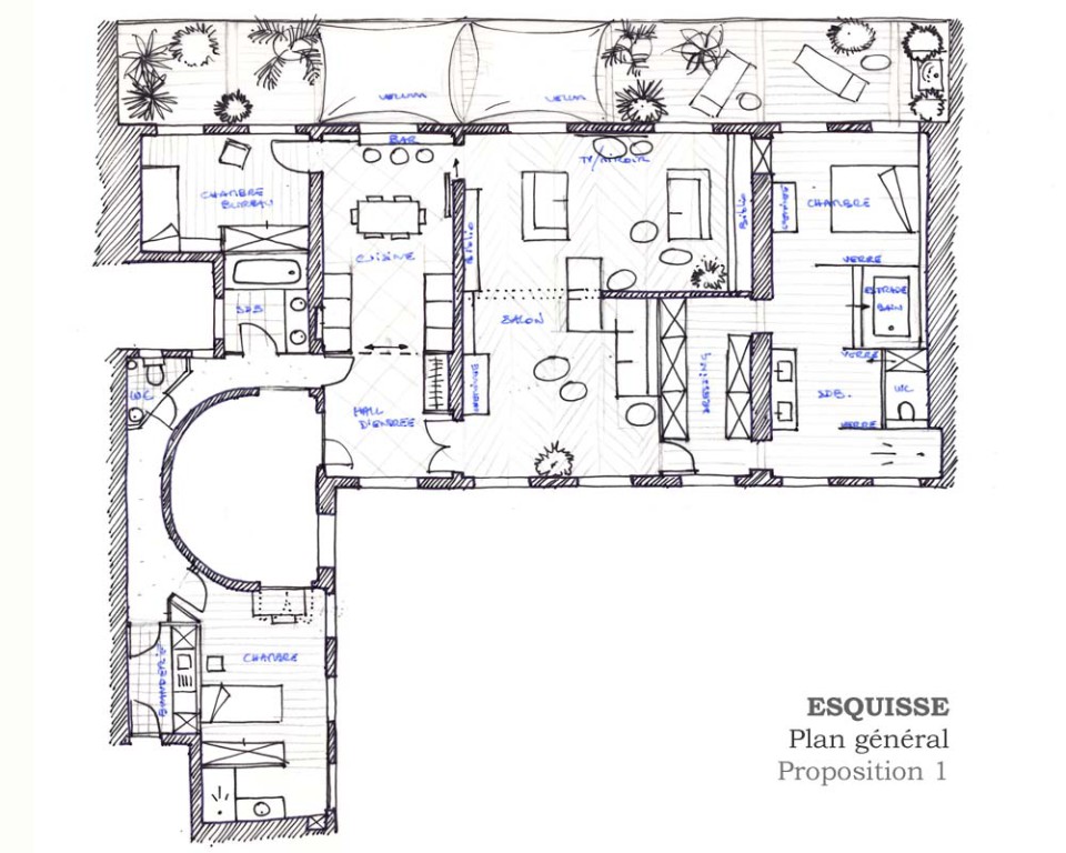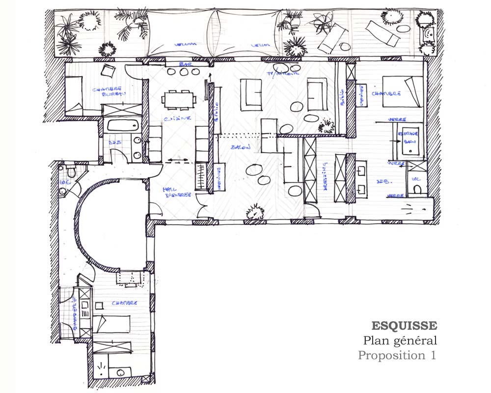 C’est une recherche sur calque où nous posons nos idées. Cette étape doit vous permettre de clarifier votre programme et d’affiner votre cahier des charges. Ce travail d’esquisse est fait jusqu’à votre entière satisfaction : votre projet doit vous correspondre pleinement !