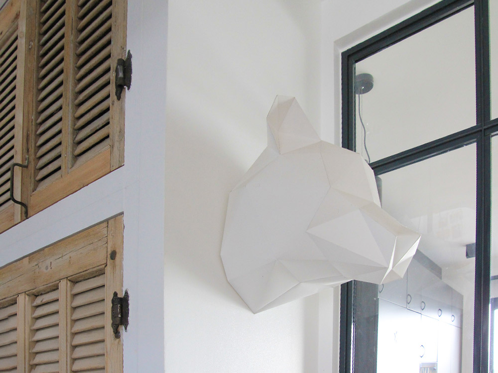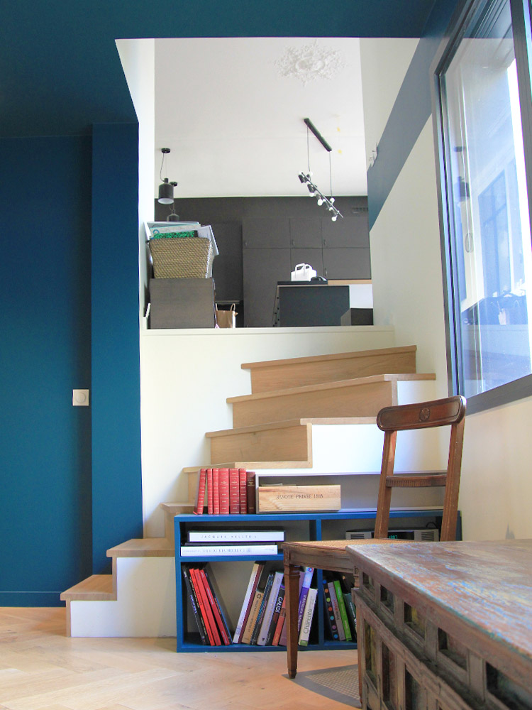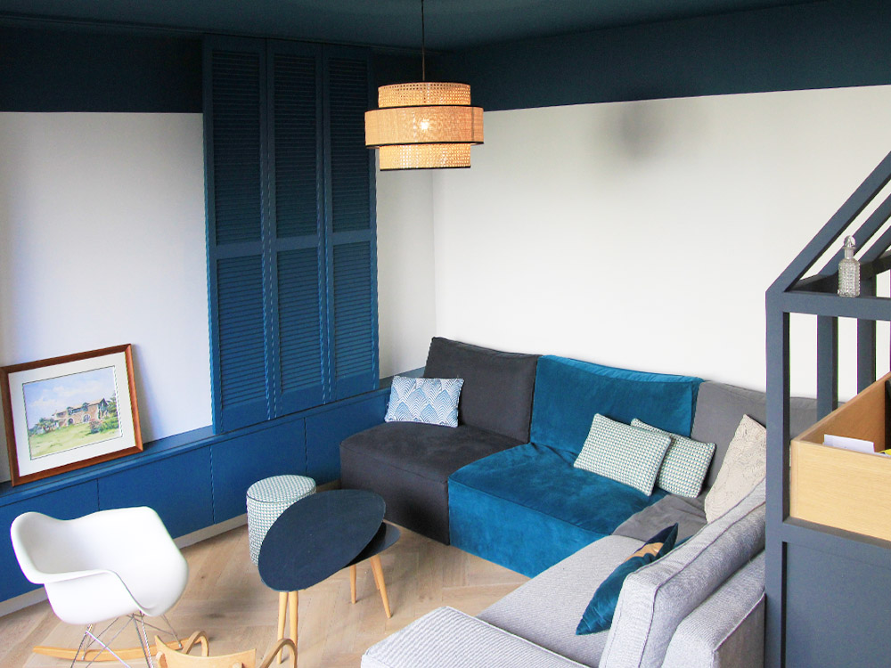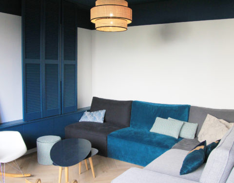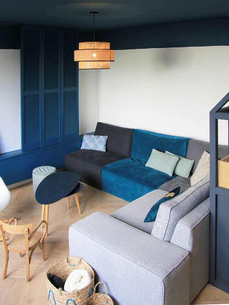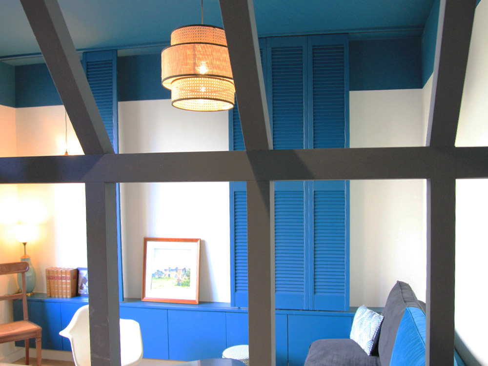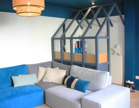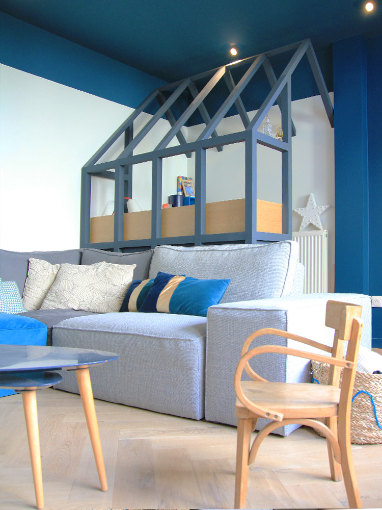 La cabane, véritable pièce bureau miniature, est volontairement au centre de toutes les attentions. Il vient se loger juste à coté du canapé dans le salon et apporte un air de vacances à cette pièce semi enterrée.
