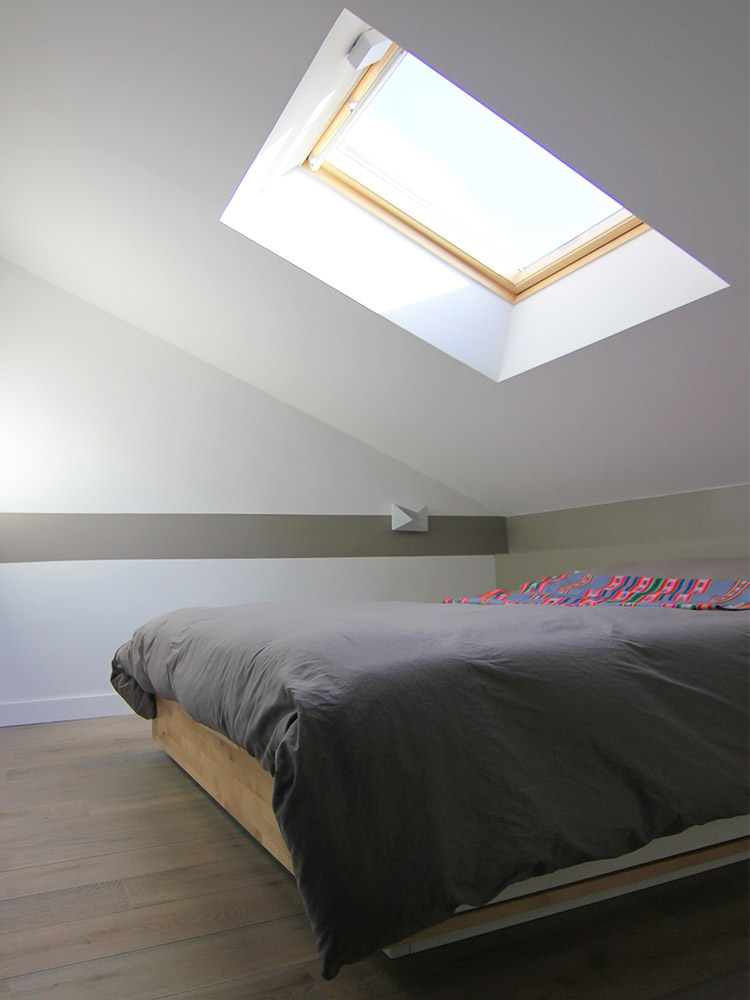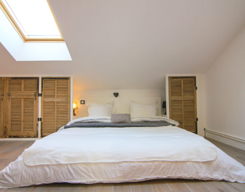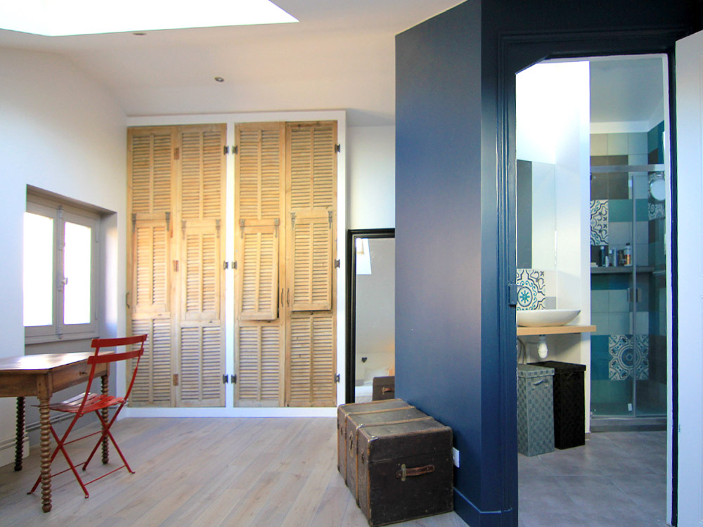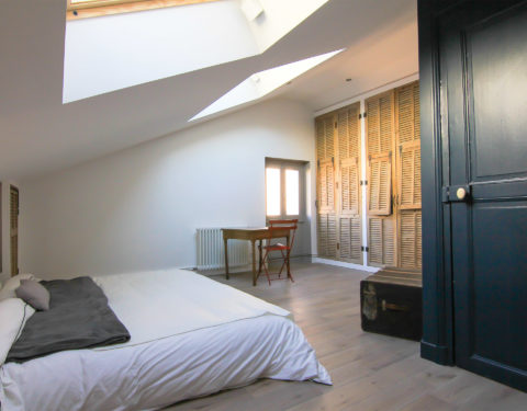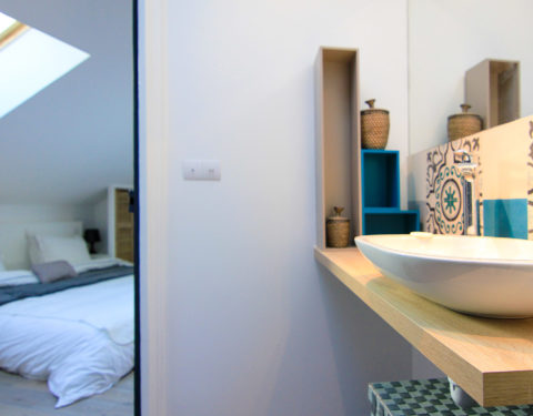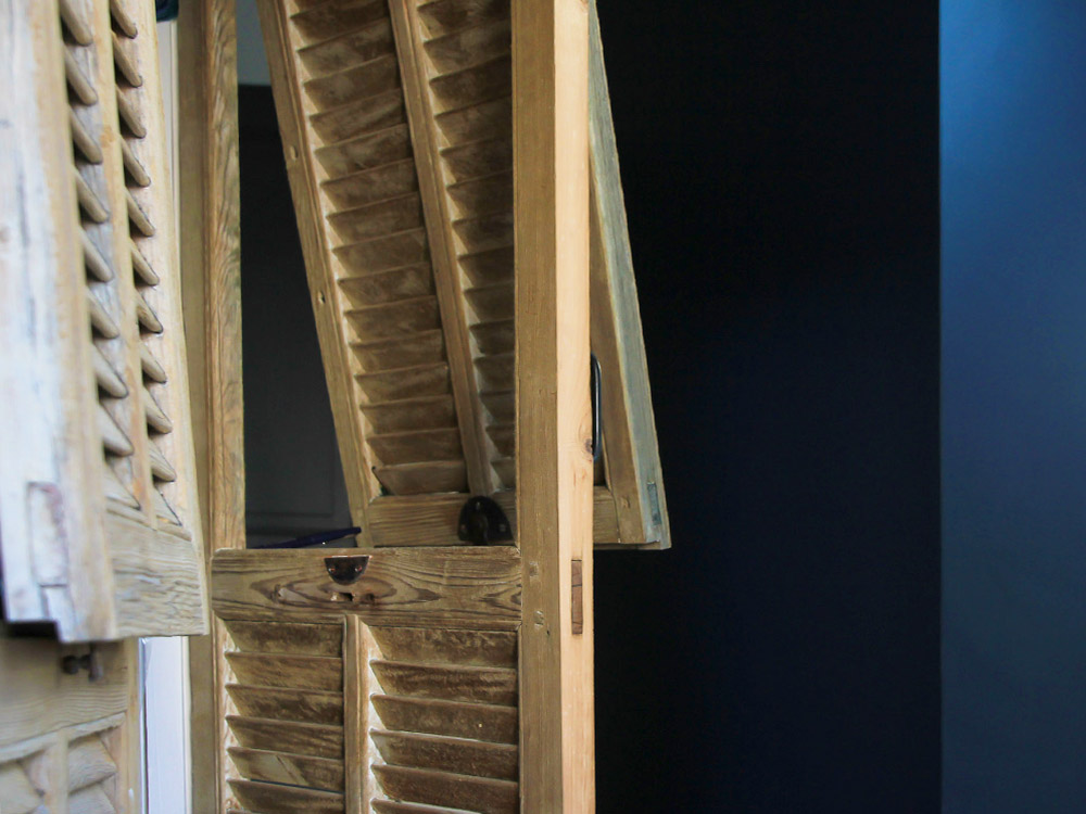 Sous les toits, la suite parentale dissimule une salle d’eau de forme hexagonale, créant ainsi une entrée, un dressing et un espace nuit plus intime. L’esprit de vacances de la maison se retrouve une nouvelle fois ici avec les portes de placard en vieilles persiennes de Venise récupérées et rénovées.
