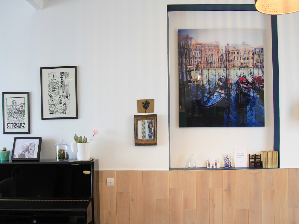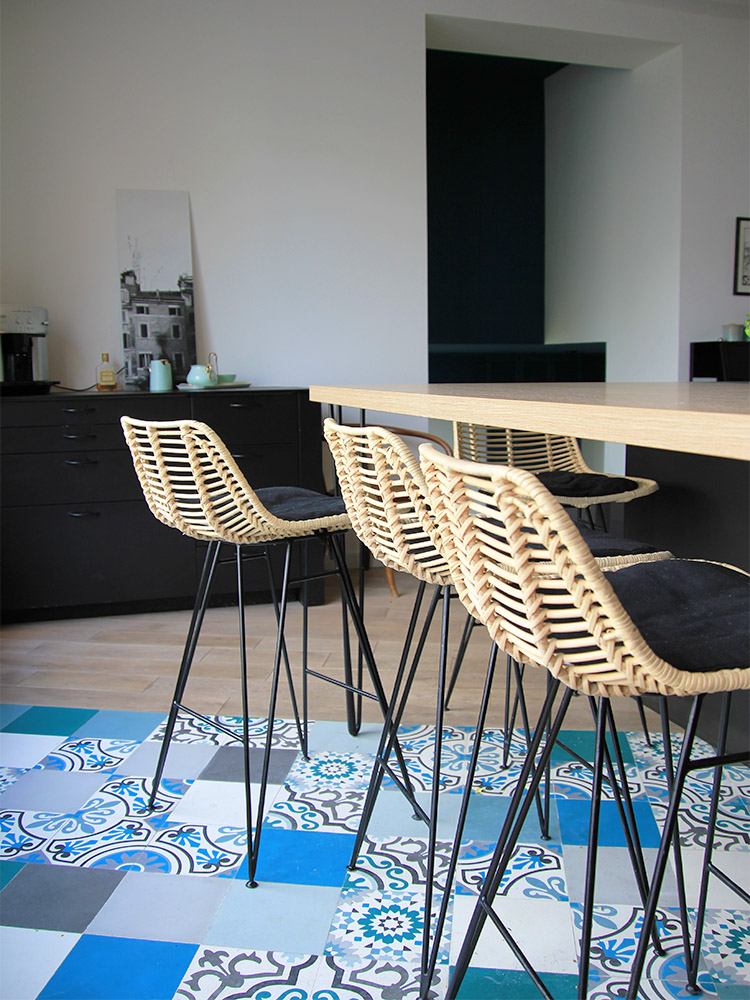 Le RDC de la maison (de facture classique) a été rénové suivant une ligne directrice en diagonale. Cette ligne intègre la cuisine et son îlot, la position du parquet et des carreaux de ciment au sol et se retrouve jusque dans la forme de la terrasse.