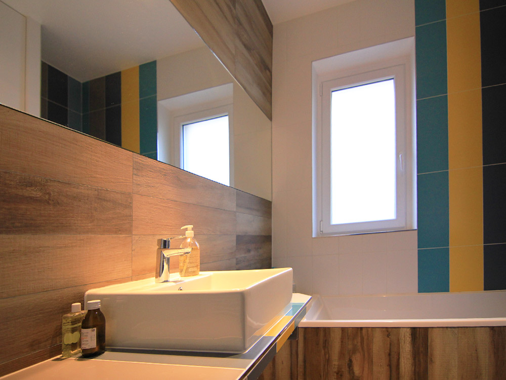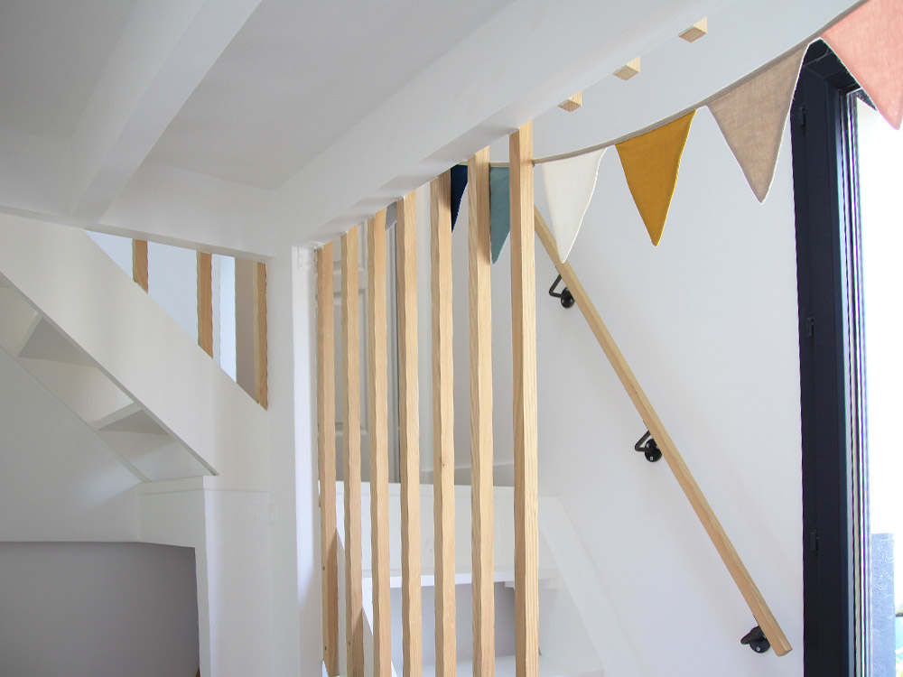 Au premier étage, nous avons placé les trois chambres d’enfants avec leur salle de bain en bois. Les deux premières chambres sont chic et classiques et la troisième reprend le thème de la cabane avec sa mezzanine fermée par des tasseaux en bois. Espace très ludique pour les enfants qui adorent s’y retrouver à plusieurs pour réinventer le monde.