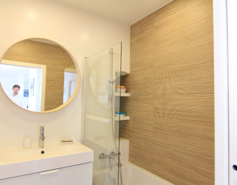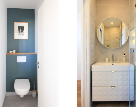De leur côté, les parents souhaitaient avoir leur propre salle de douche. On a réussi à la créer dans seulement 2m², avec une belle douche et un grand lavabo !