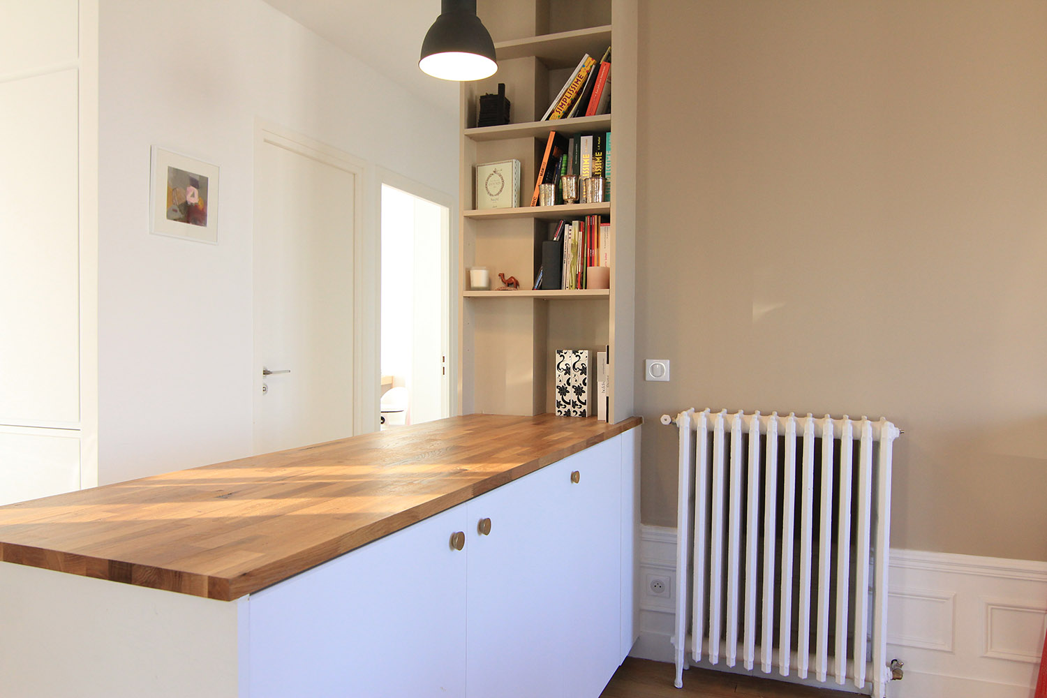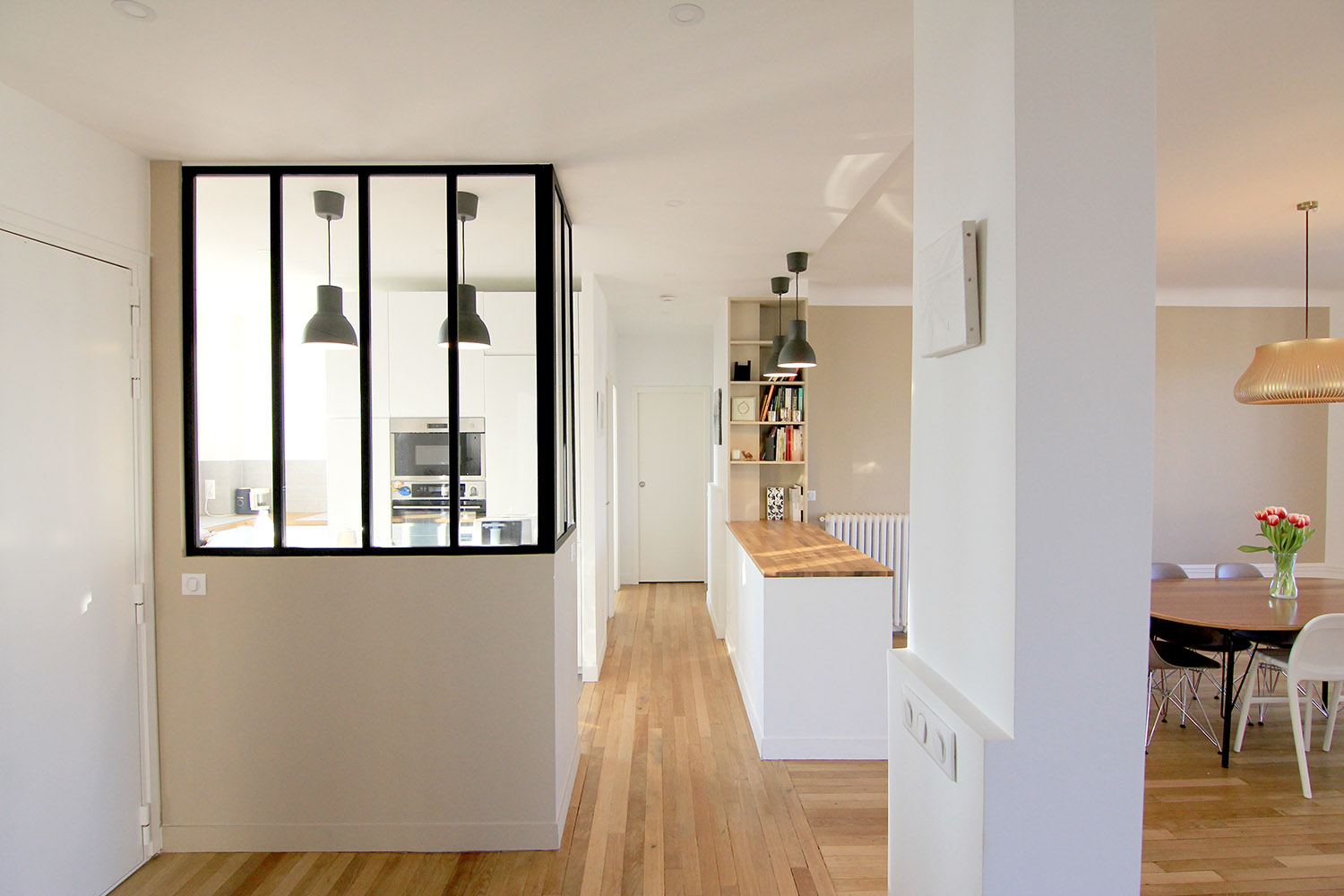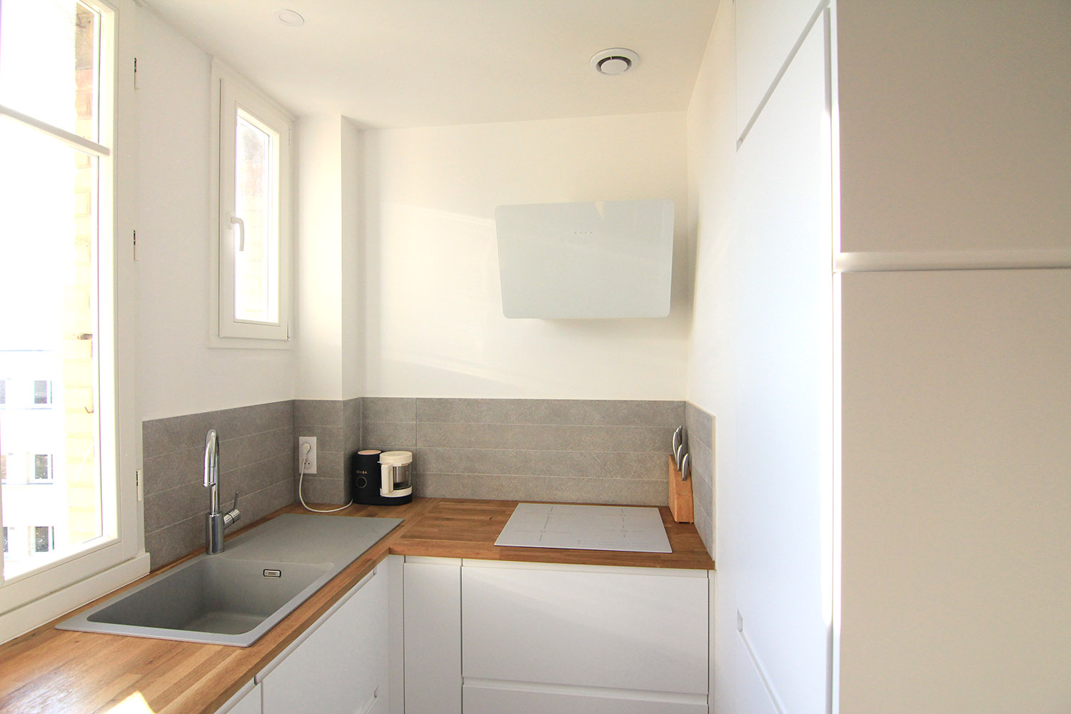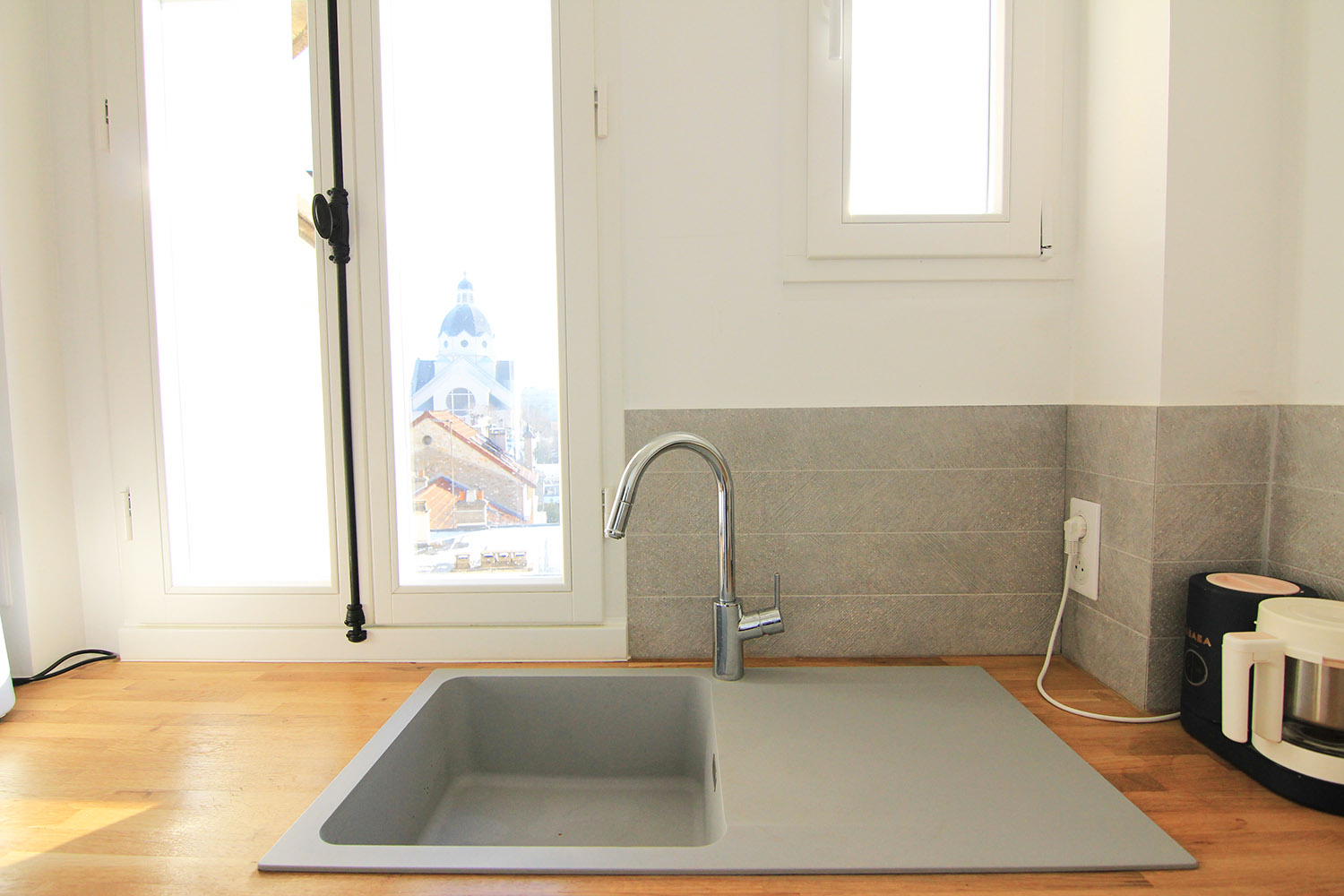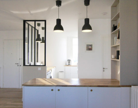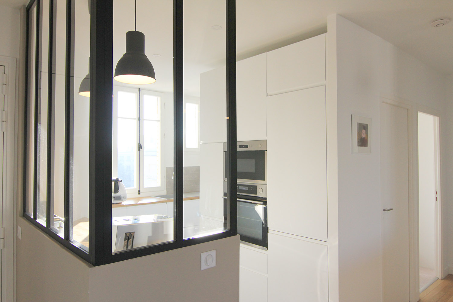 L’ancienne salle de bain accueille la nouvelle cuisine qui récupère les quelques m² de l’entrée. On a aussi déplacé les WC pour gagner encore un peu d’espace dans la cuisine. Elle est laissée ouverte grâce à sa verrière d’angle. La pièce de vie devient ainsi traversante et gagne une belle luminosité. L’ancienne fenêtre translucide devient transparente et profite de la très belle vue sur une jolie façade d’église.
