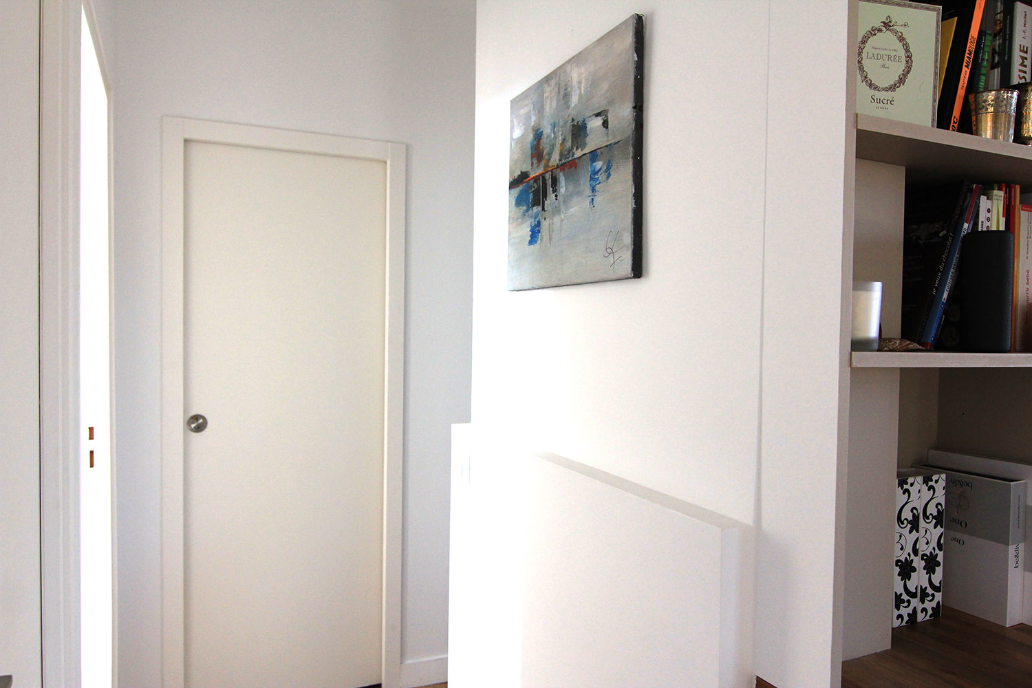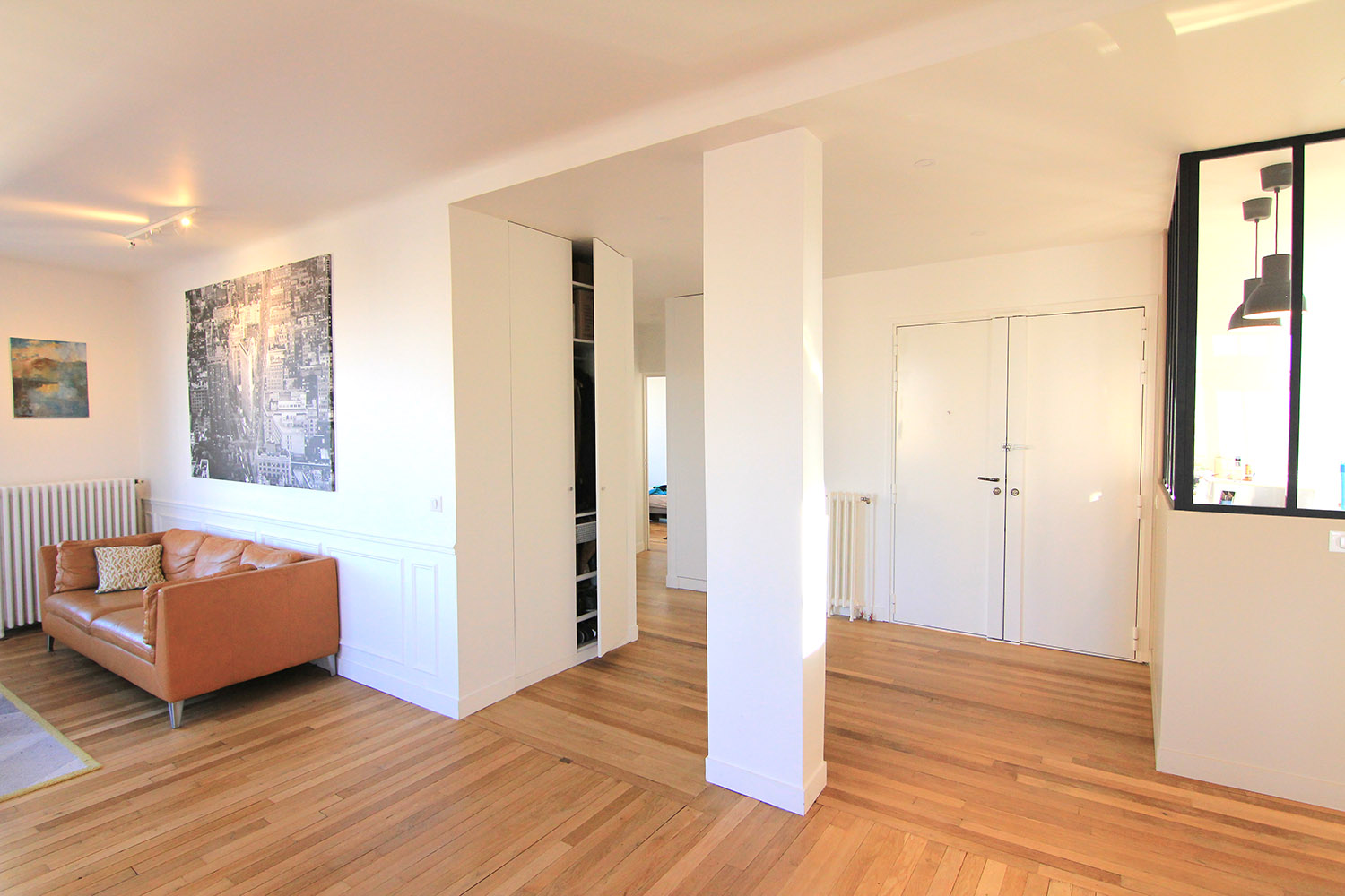 D’abord, la grande entrée est réduite pour donner des m² à la future cuisine, et surtout ouverte pour recevoir la lumière naturelle du séjour. Bien sûr on en a profité pour créer un vestiaire accueillant manteaux et chaussures.