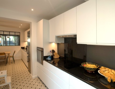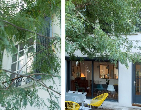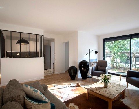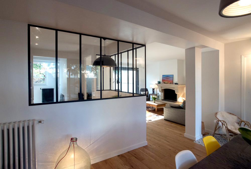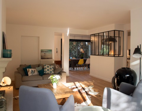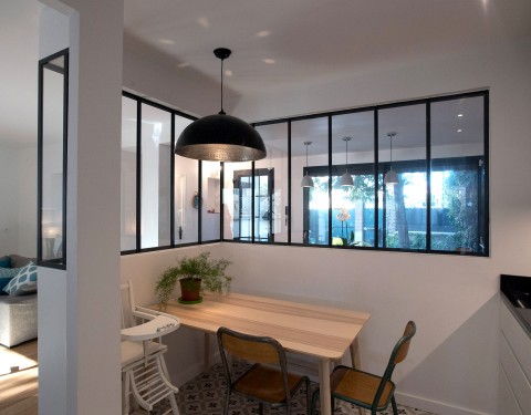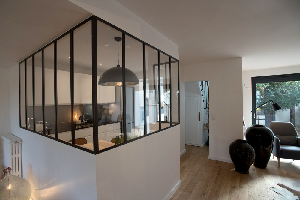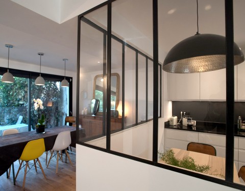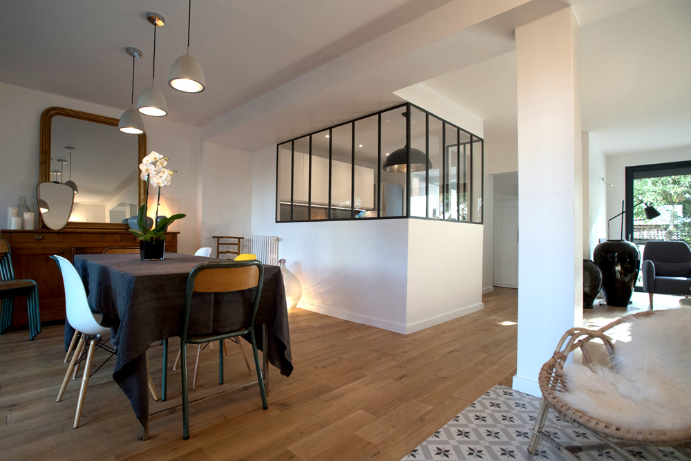 Ainsi l’extension du salon est largement ouverte sur le jardin. La cuisine s’allonge et communique avec le séjour par une large verrière.