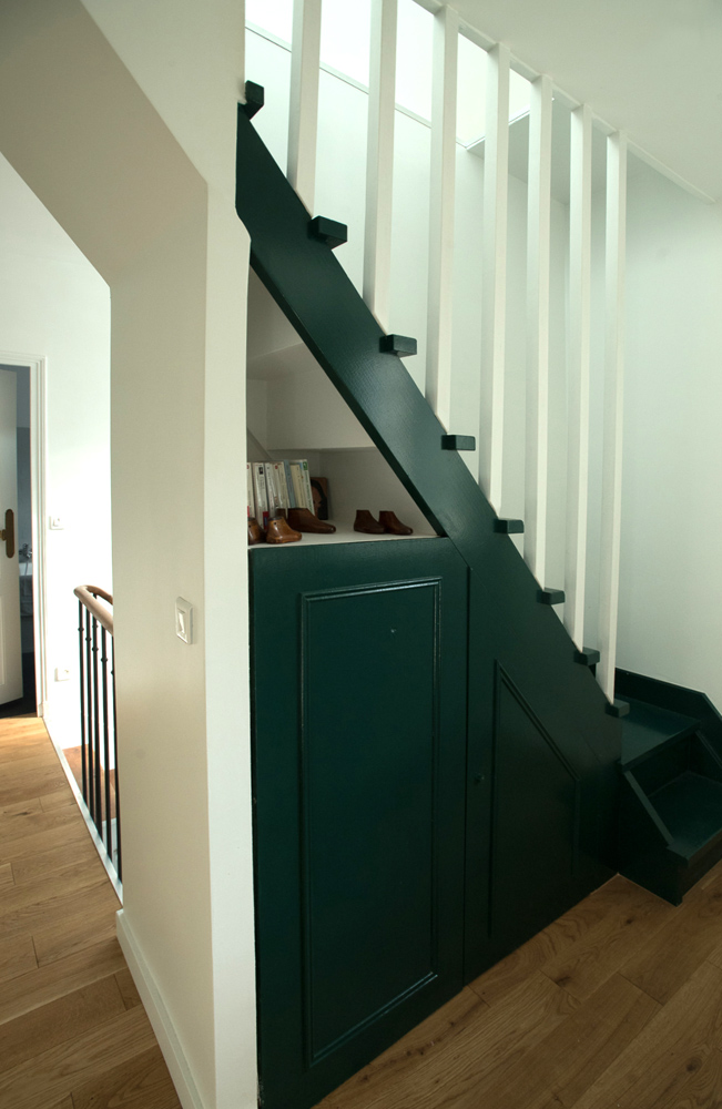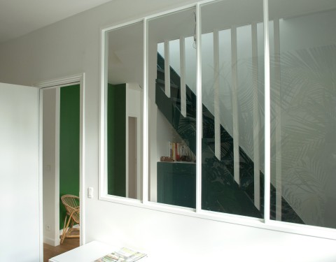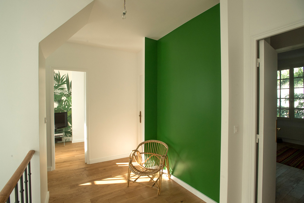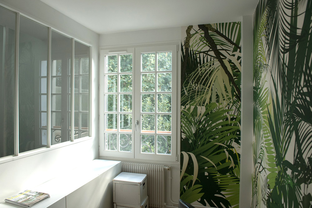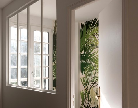 A l’étage, 2 chambres existantes ont pris de l’ampleur grâce aux m² créés. A côté, le bureau est connecté à la vie de la maison par sa grande verrière immaculée, qui joue à refléter le motif végétal du papier peint.