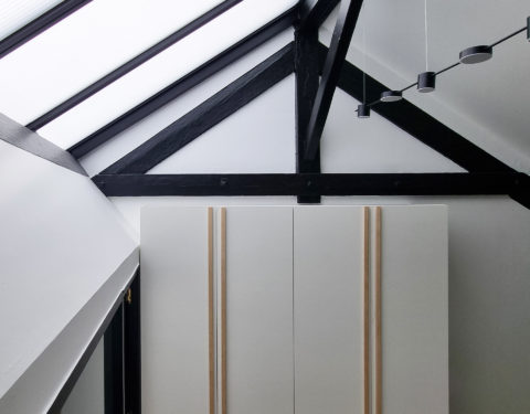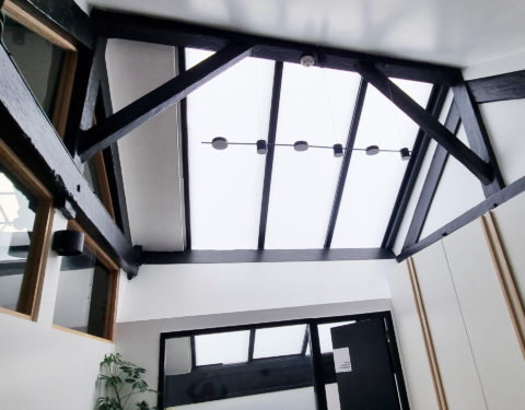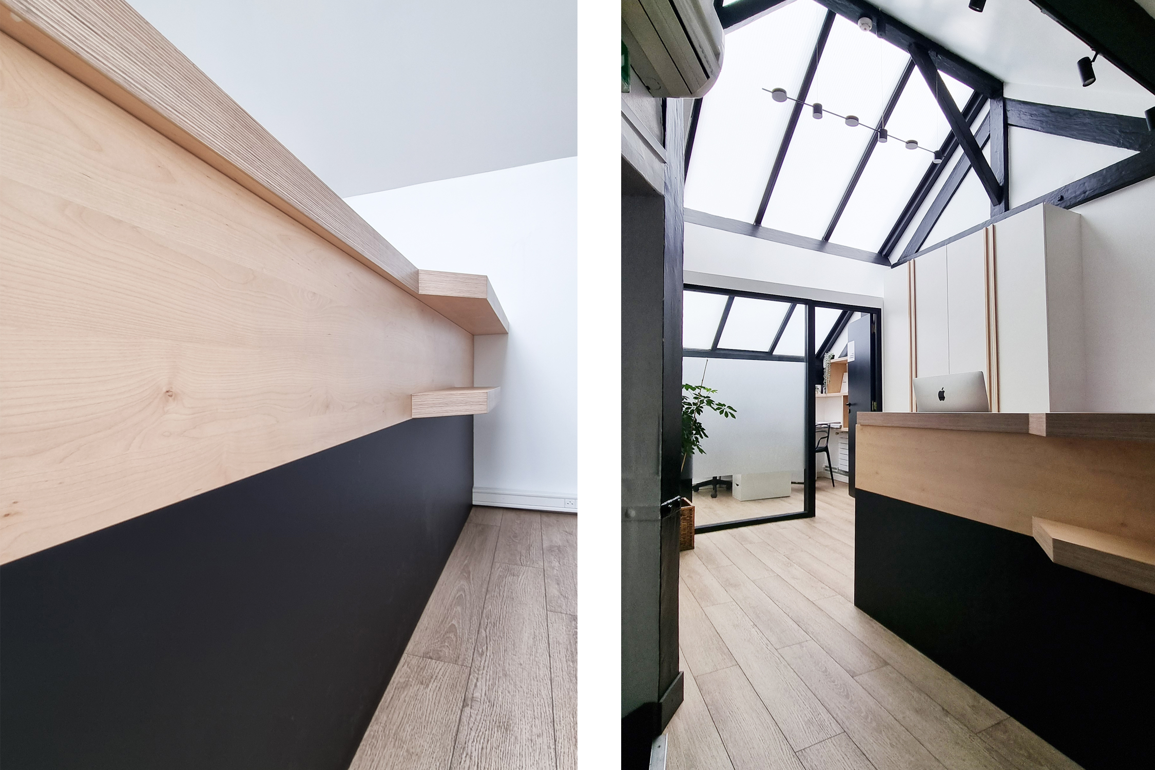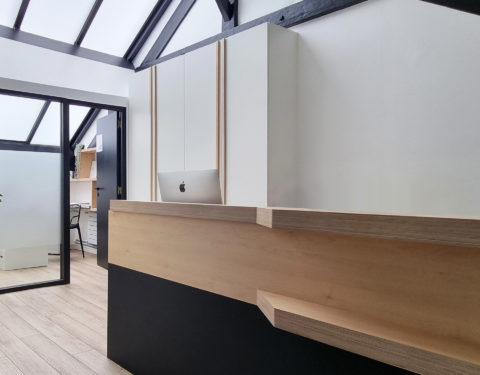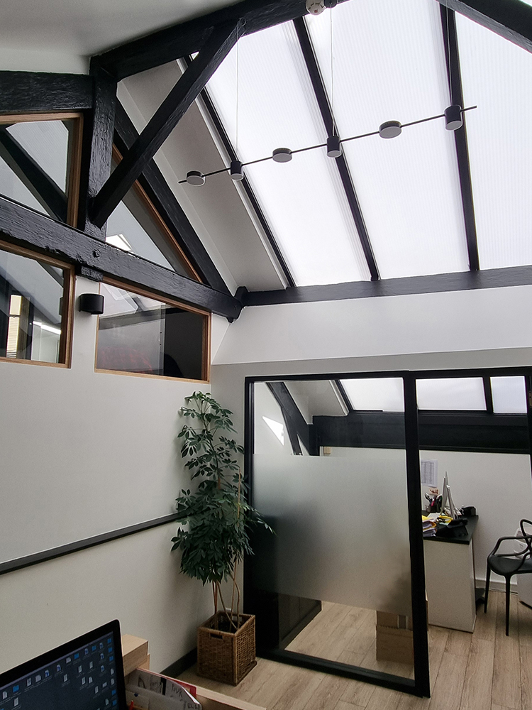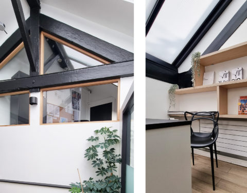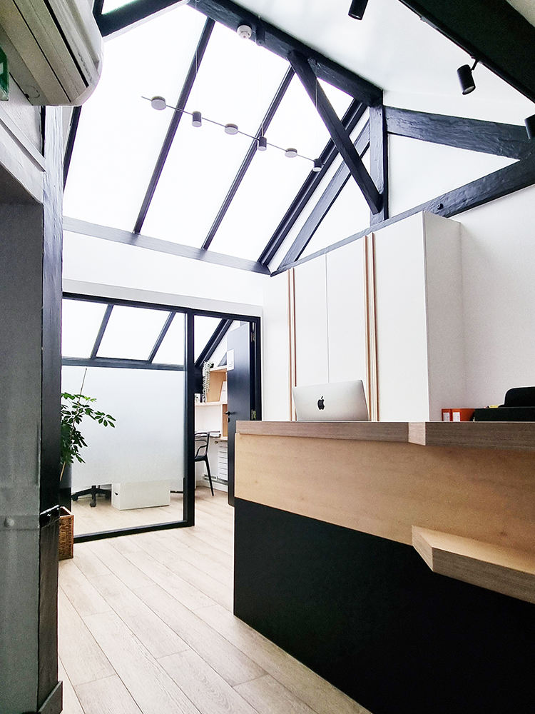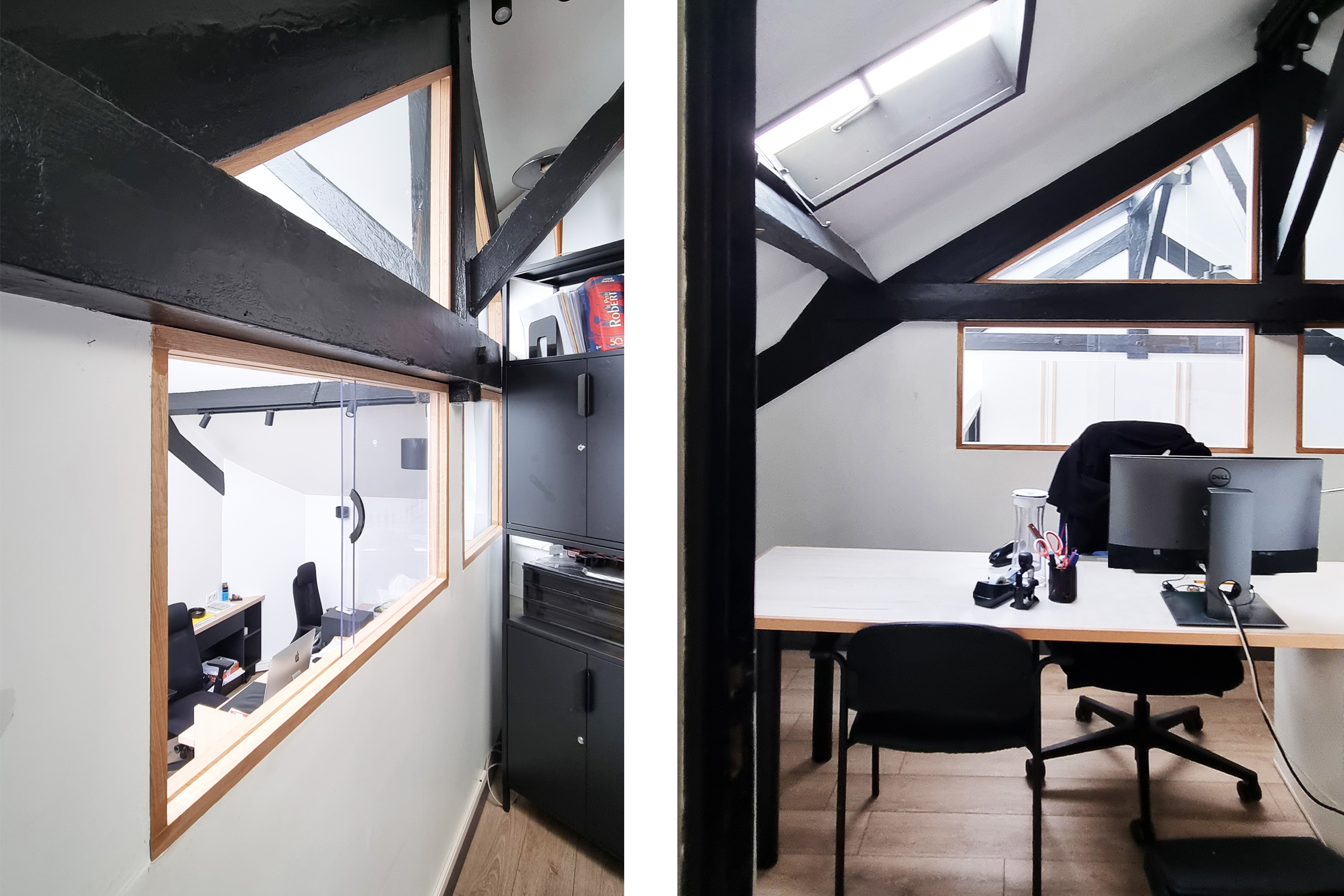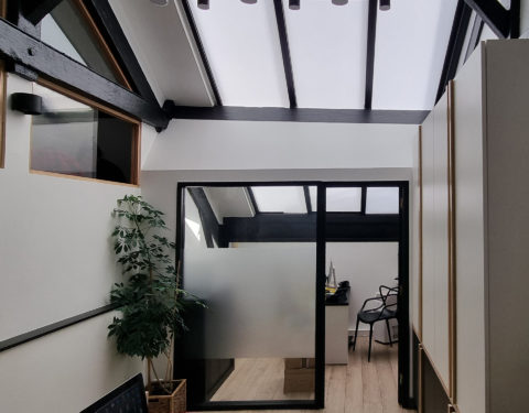 Celui-ci avait besoin de plus de confidentialité entre l’entrée des lieux et les bureaux. Il manquait aussi un bureau fermé pour les rdv. Nous avons pour cela fait des bureaux fermés avec un jeu de verrières et de cloisons vitrées pour laisser traverser la lumière du grand châssis vitré en toiture.