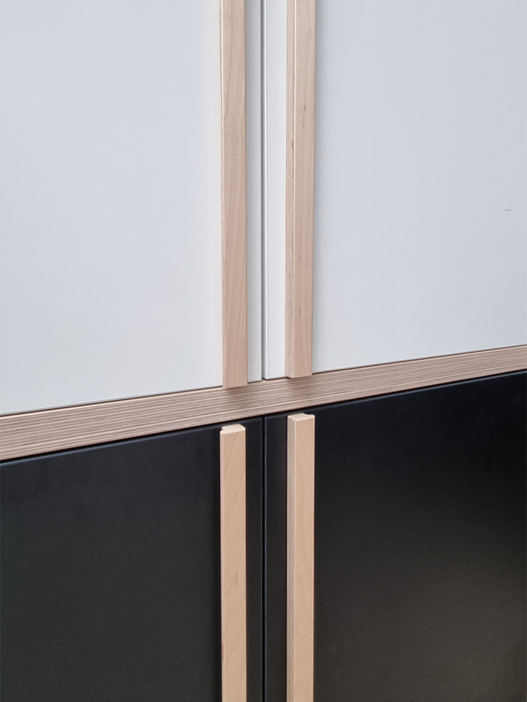 De grands rangements étaient bien sûr indispensable pour les dossiers administratifs. Nous avons dessiné le double comptoir d’accueil. L’ensemble a été unifié avec le reste de l’école en reprenant la charte graphique de celle-ci, à savoir le bois, le noir et le blanc.