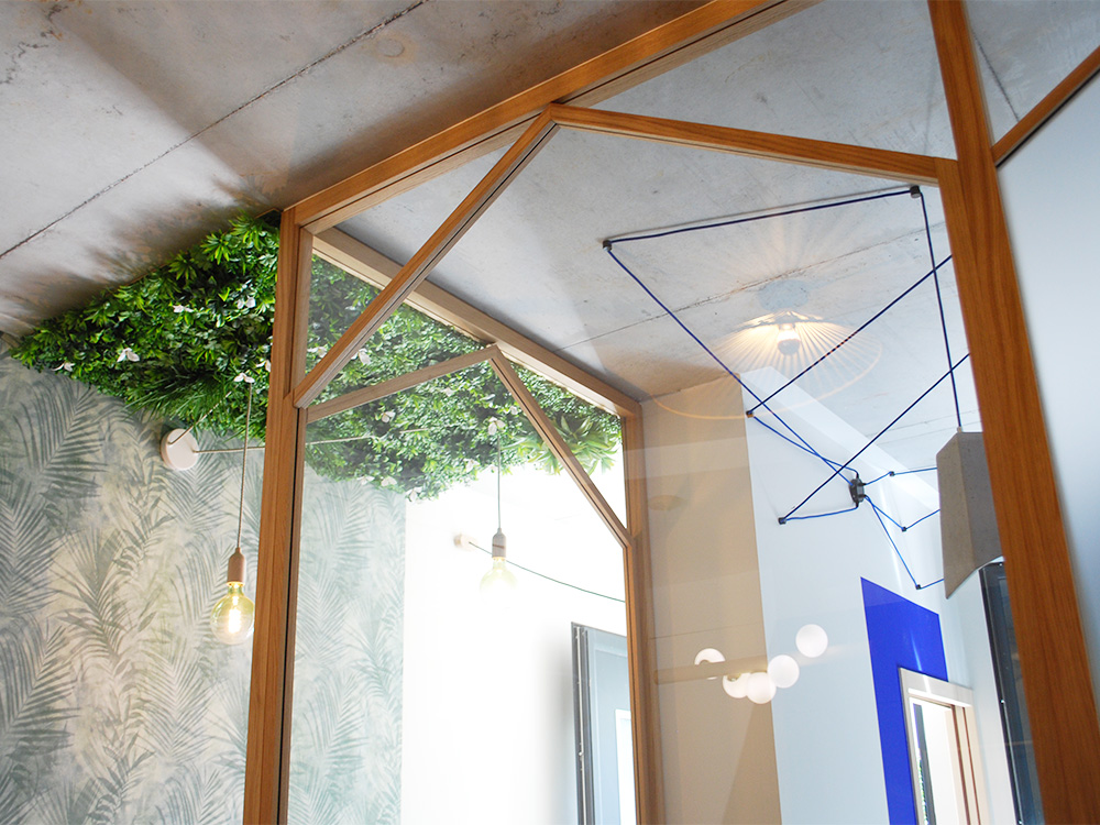 L’étage est rythmé par des univers de travail distincts : le cabanon (1 bureau) et la cabane (2 bureaux) sont des lieux fermés, pour un maximum de tranquillité, qui restent ouverts à l’aide de jeux de verrières sur le dernier univers : l’espace commun de coworking. La vue donne donc indirectement sur le jardin en bas de nos fenêtres.