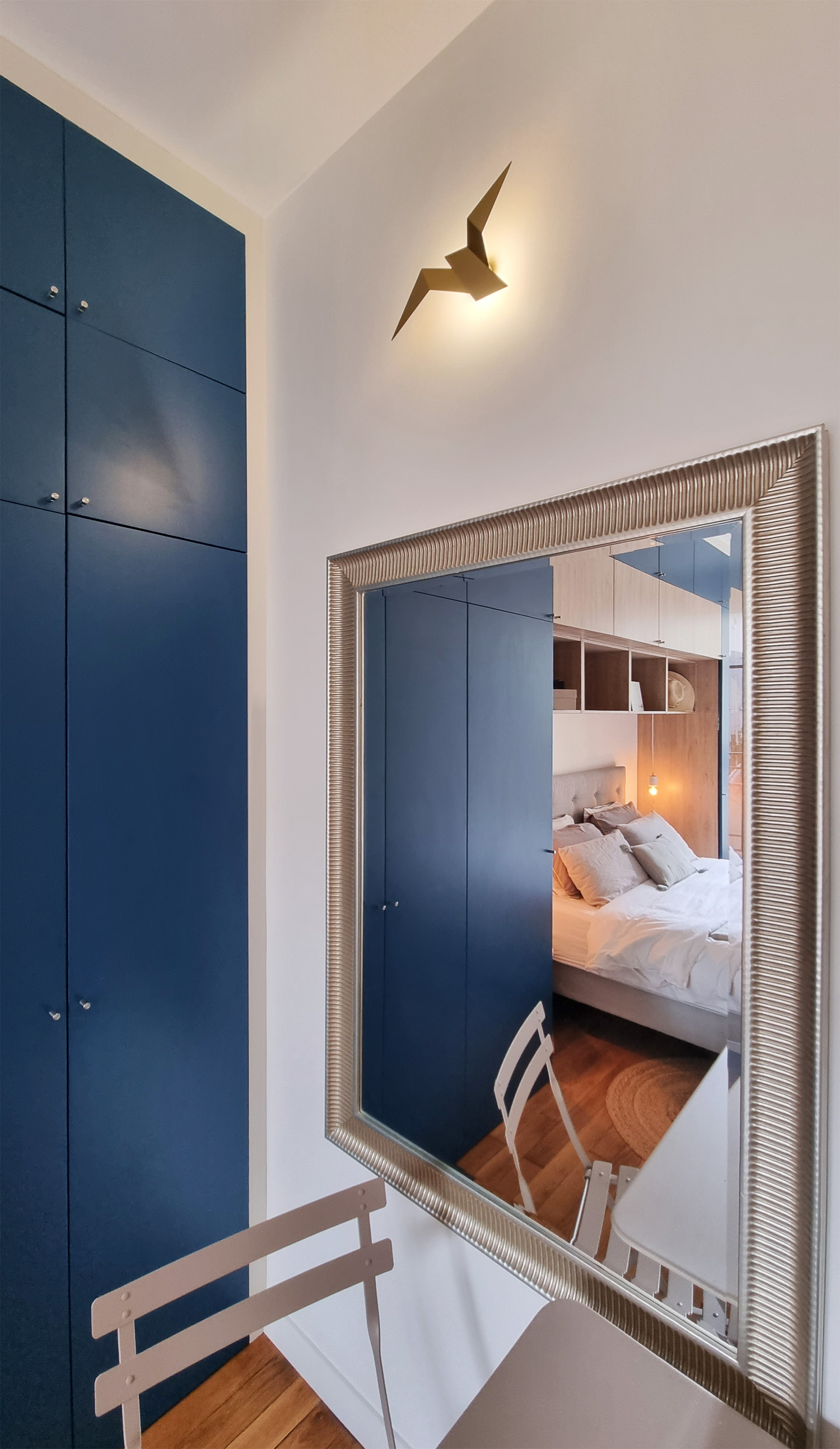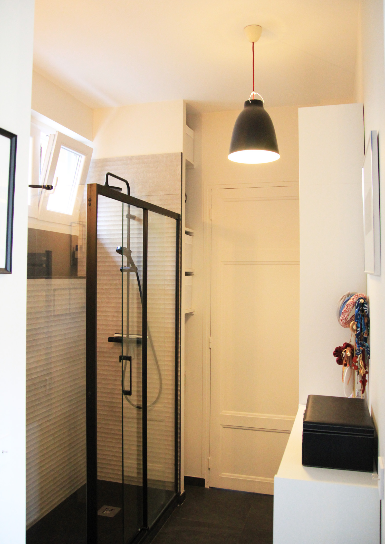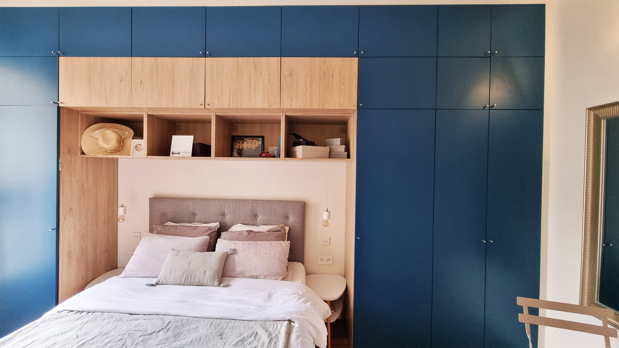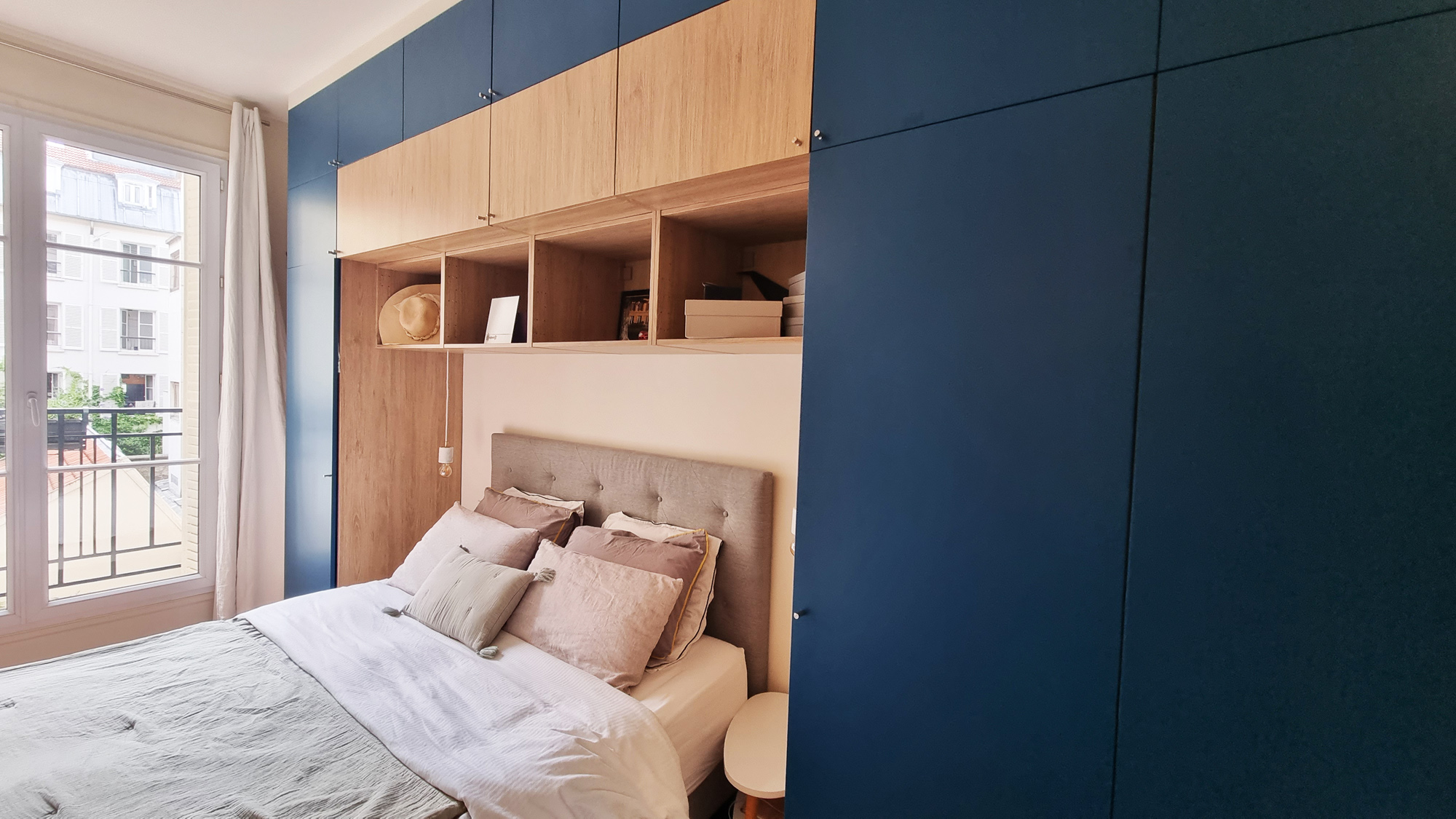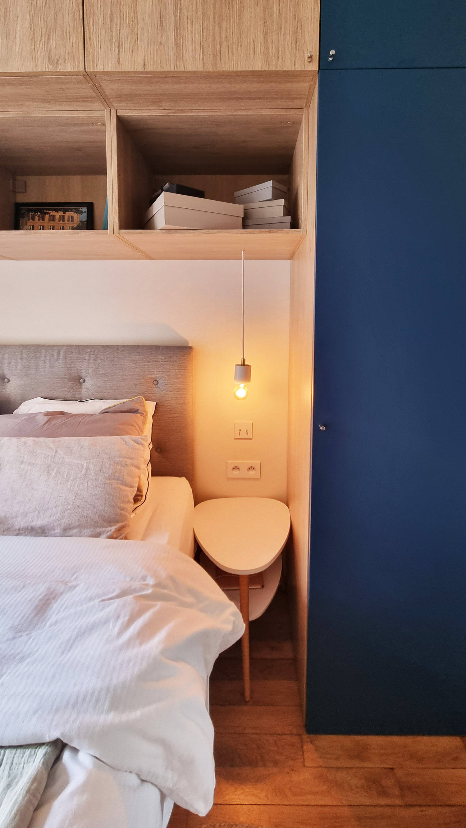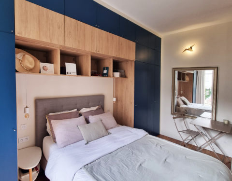 Pour finir la chambre bleue, pour les parents, réunit une salle de douche ouverte et un grand rangement en tête de lit. Cet appartement propose donc maintenant 3 chambres et 2 pièces d’eau. Plus approprié pour la vie de famille !