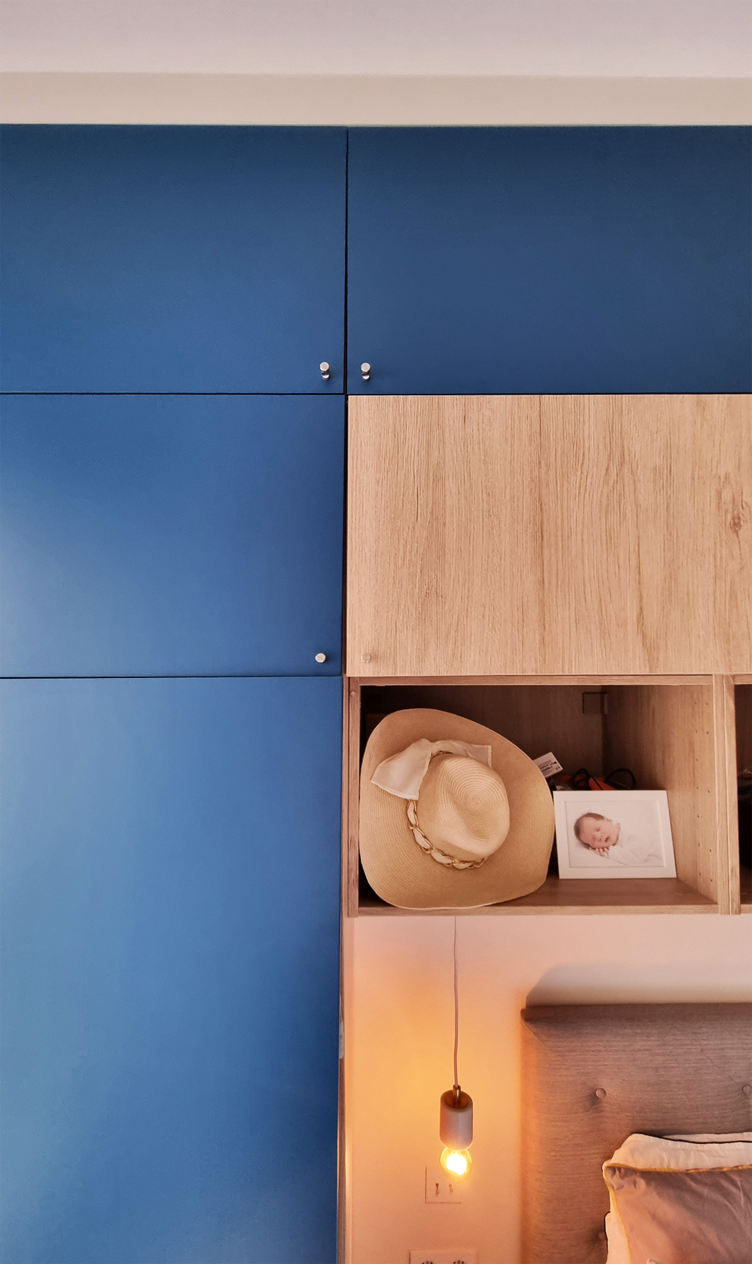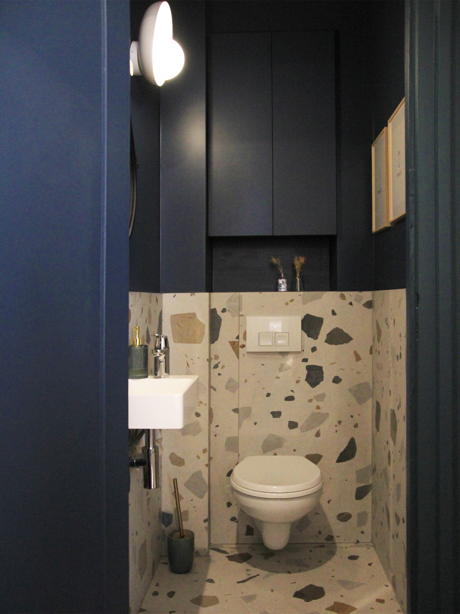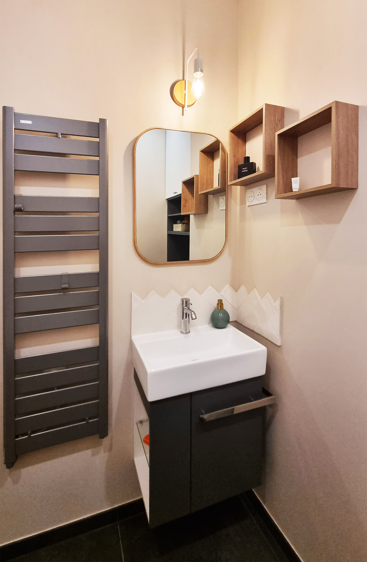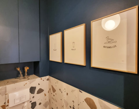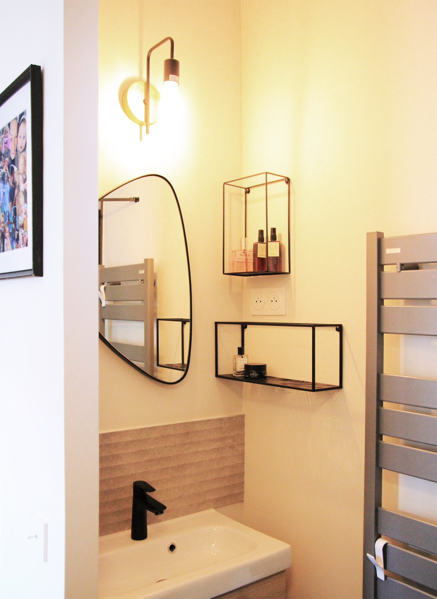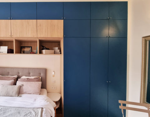 Pour finir la chambre bleue, pour les parents, réunit une salle de douche ouverte et un grand rangement en tête de lit. Cet appartement propose donc maintenant 3 chambres et 2 pièces d’eau. Plus approprié pour la vie de famille !