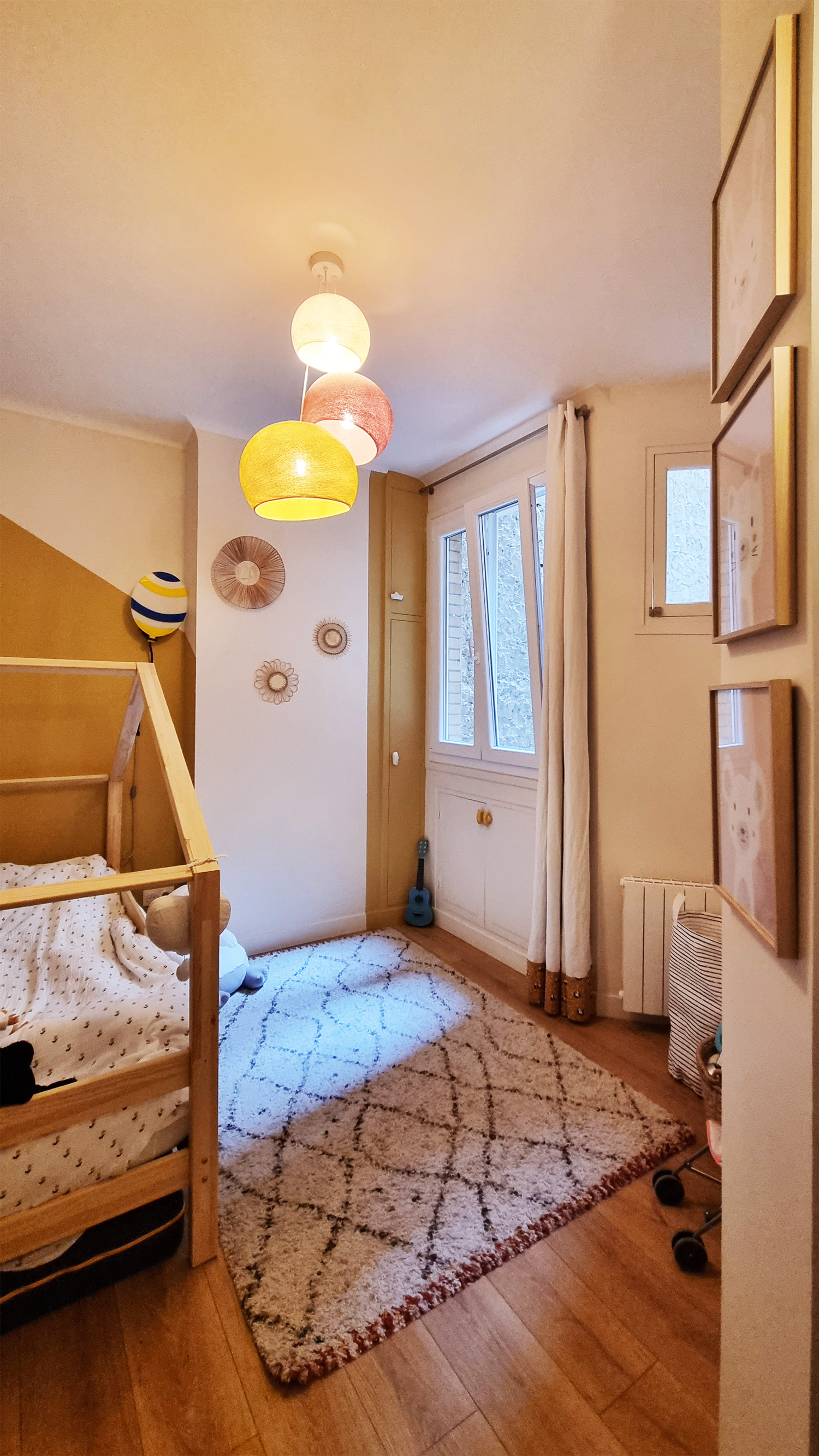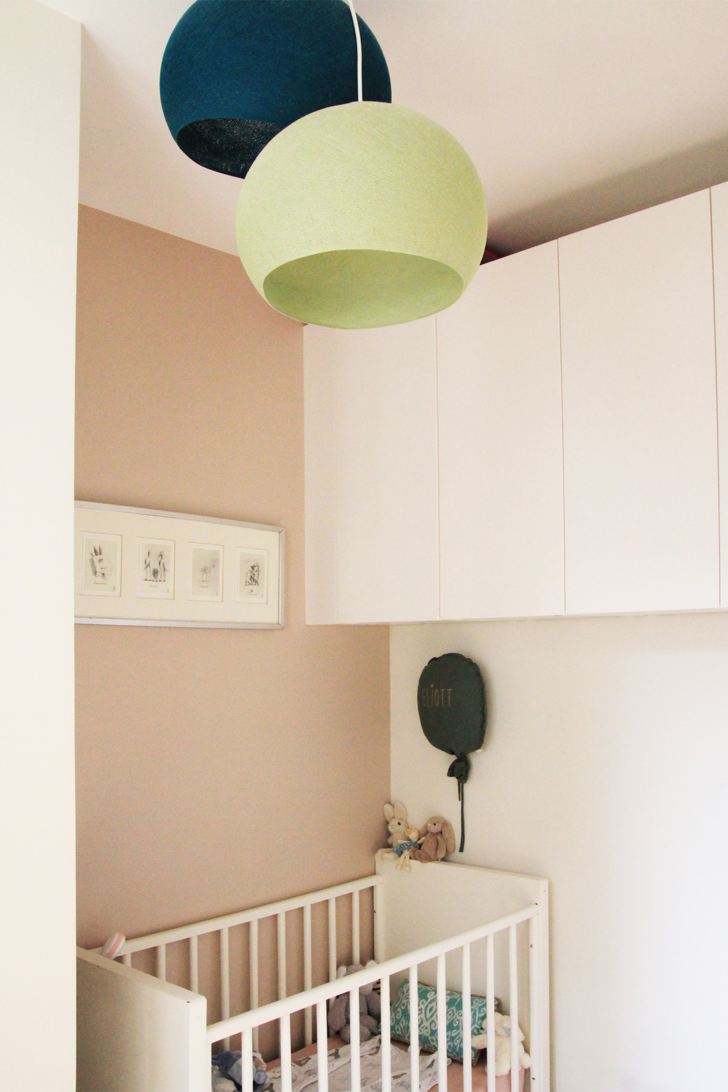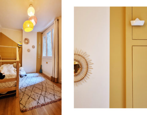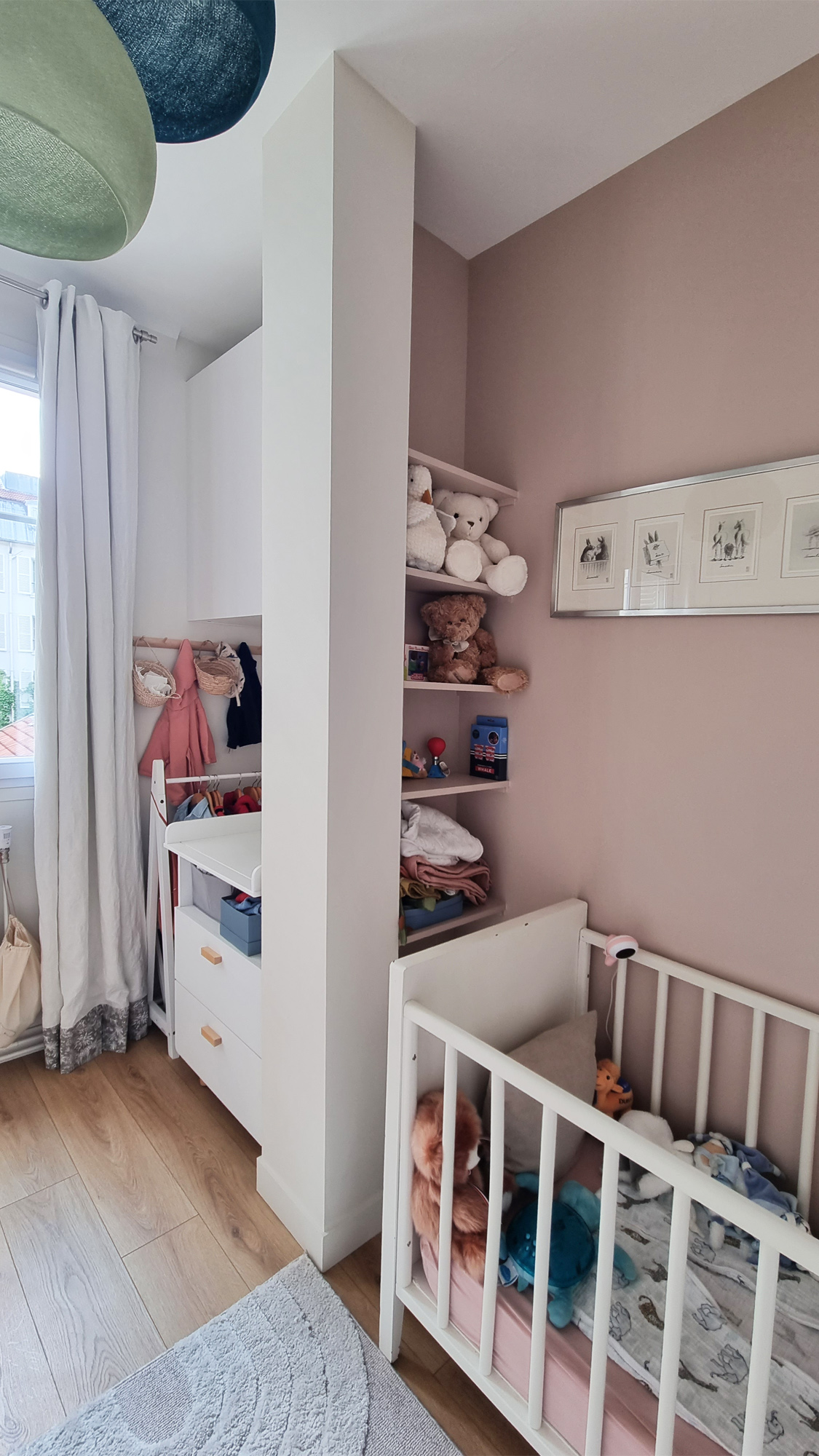 L’ancienne salle de bain devient la chambre rose, pour le bébé de la famille. On joue avec la contrainte de la gaine technique pour proposer un espace table à langer et un espace berceau avec de mignonnes tablettes intégrées.