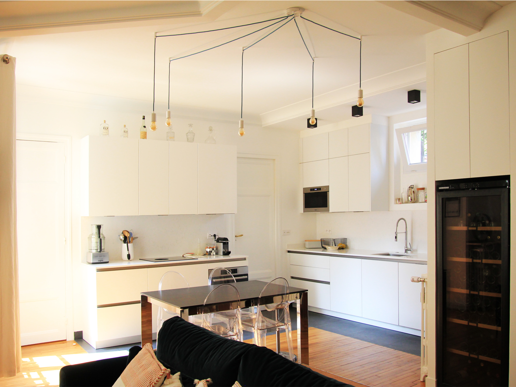La cuisine à l’ancienne, reléguée à un bout de l’appartement, est déplacée au coeur du logement. L’ancien long couloir intègre cet espace et optimise les m². Le marbre blanc très élégant sublime cette pièce immaculée. Et l’ancienne cuisine devient une charmante chambre d’enfant, la chambre jaune.