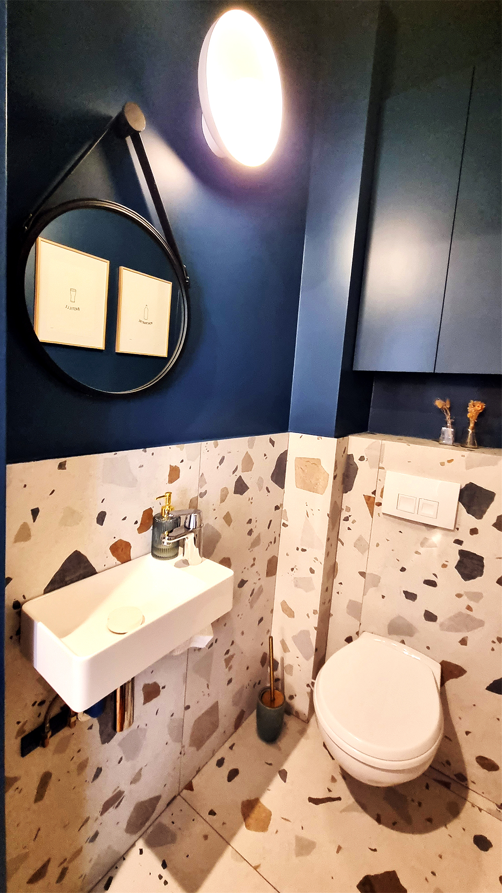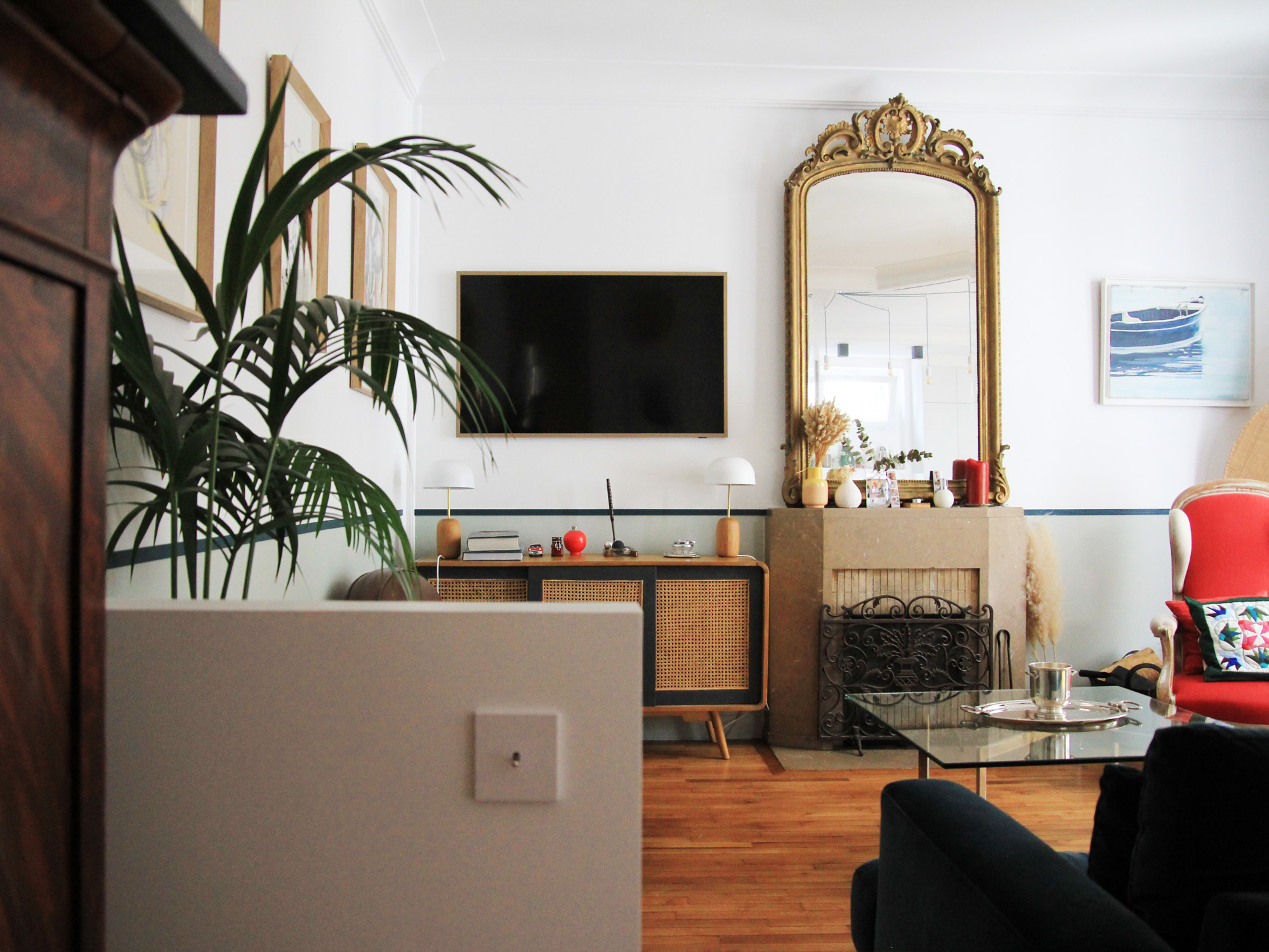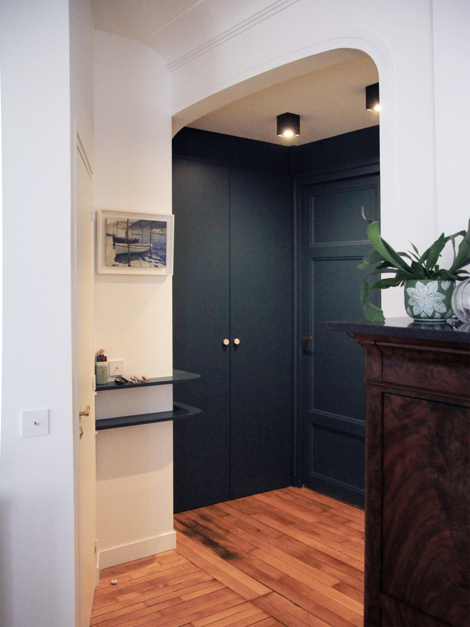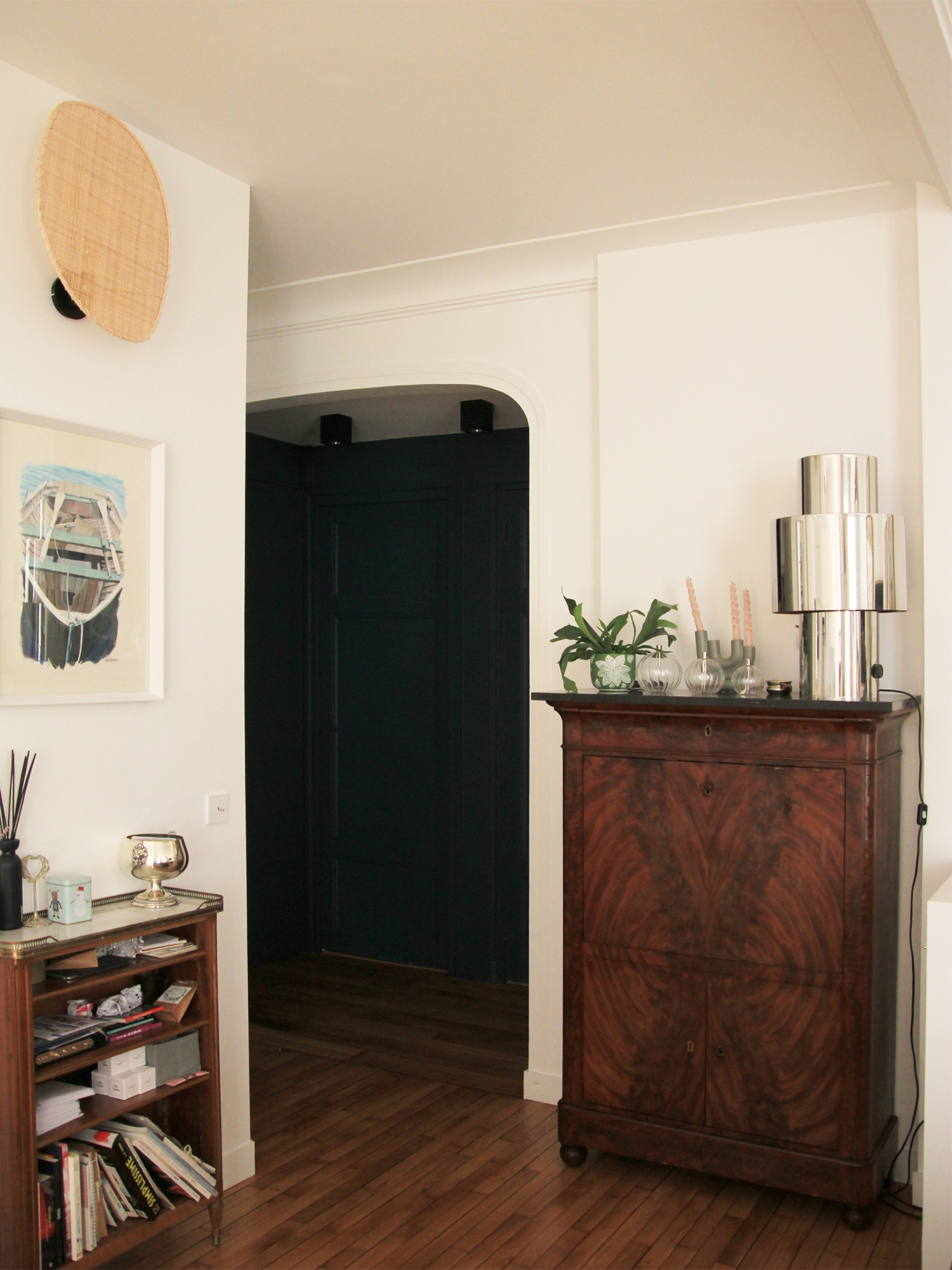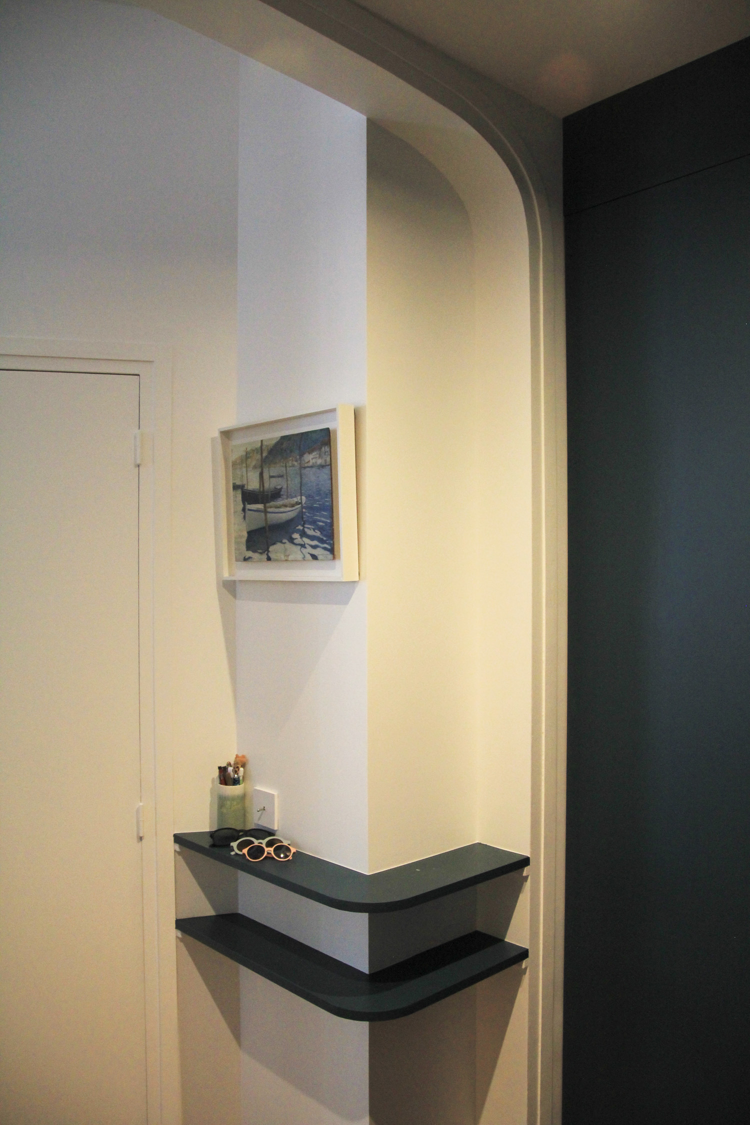 On a tout ouvert. Et voilà un séjour digne de ce nom. L’entrée et la cuisine donnent directement dessus pour agrandir la perception de l’espace. L’entrée est travaillée d’un bleu profond pour accentuer l’effet de clarté du salon. Son grand vestiaire est dissimulé par la couleur. Et les arrondis des étagères font échos à l’arrondi existant du mur de l’entrée.