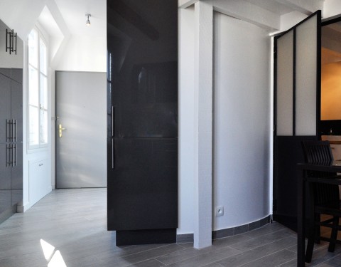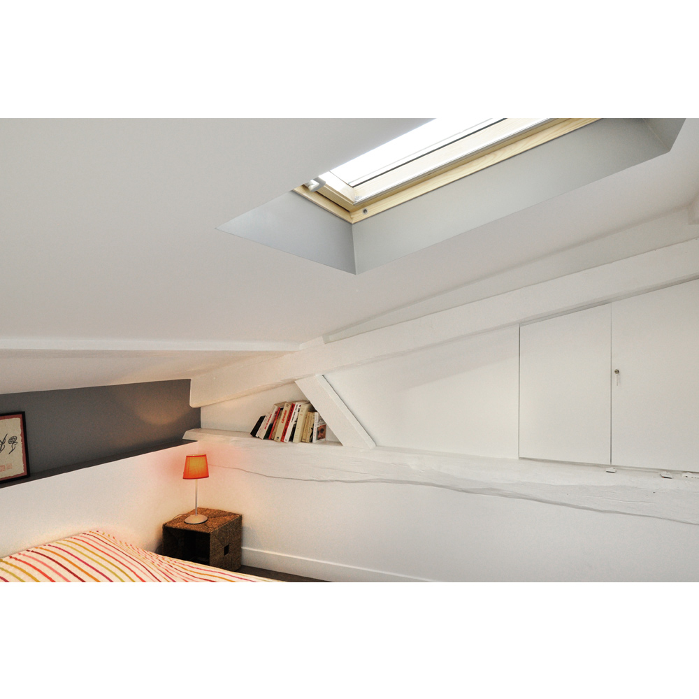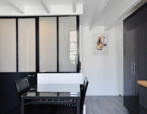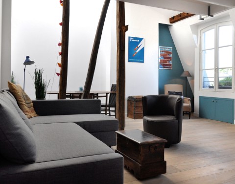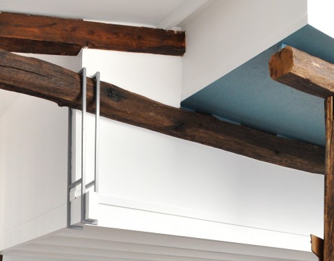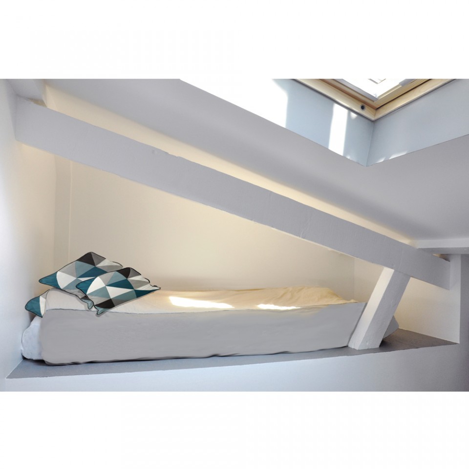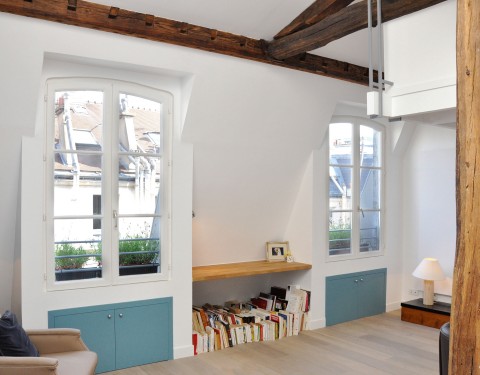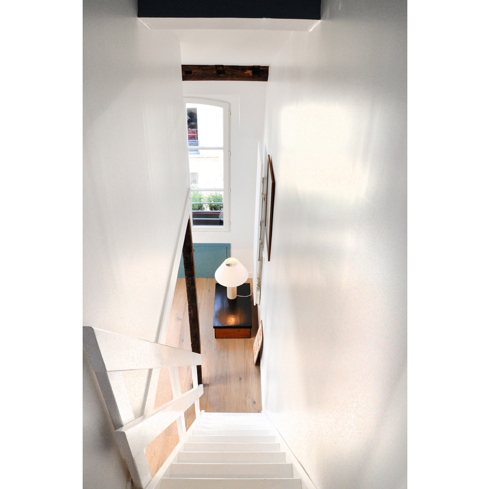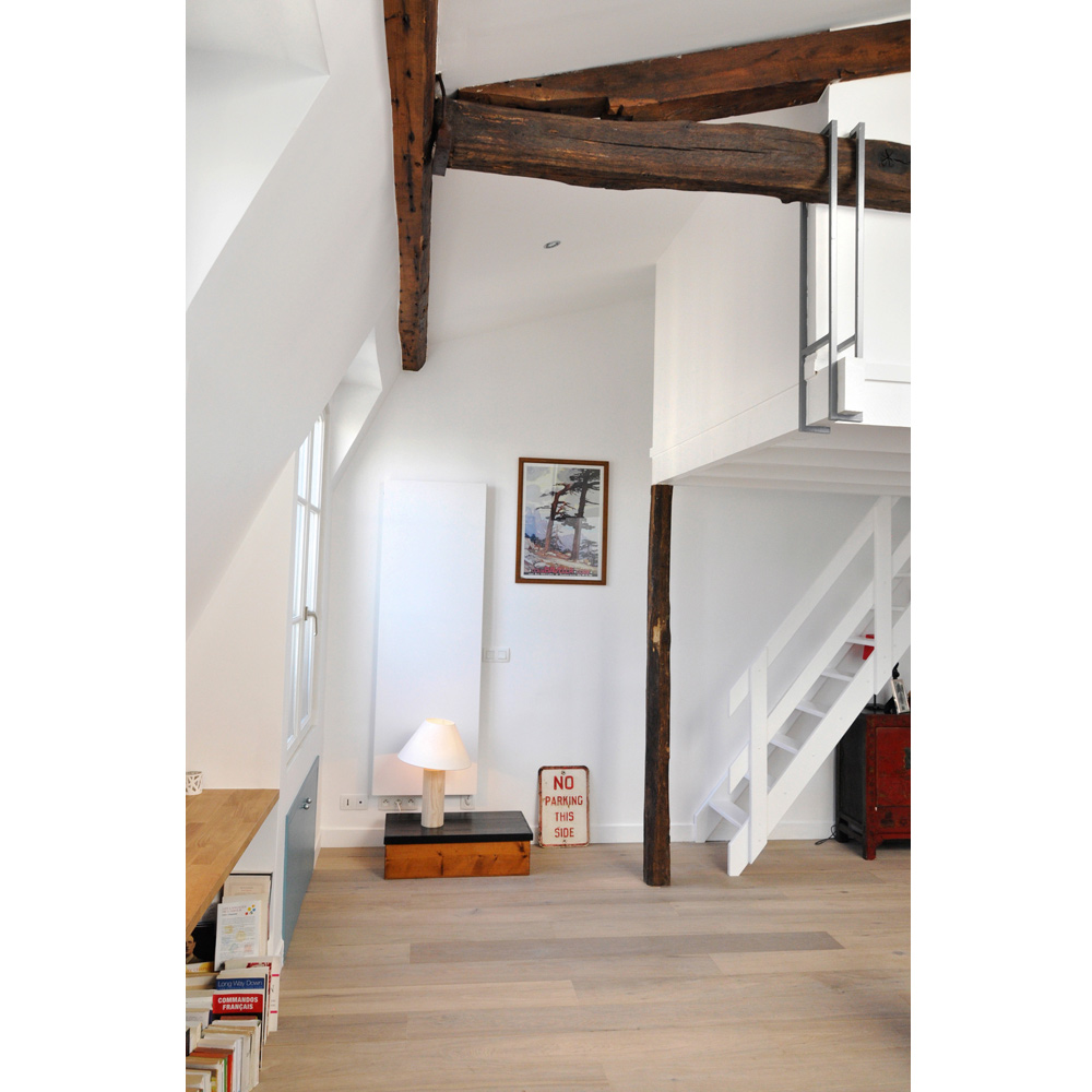 Nous avons donc créé un lieu atypique. Un système de boites suspendues cache les deux chambres à coucher tout en gardant une belle hauteur sous plafond pour profiter de la verrière de l’ancien escalier de service.