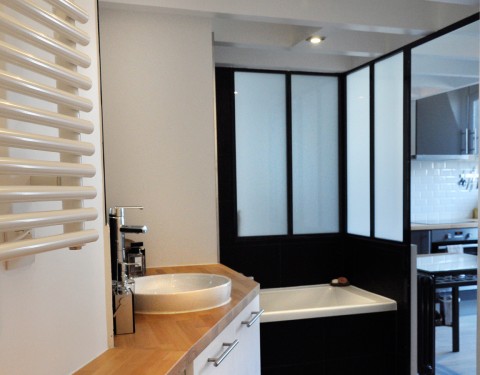 Derrière une petite verrière dans la cuisine se trouve une salle de bain confortable ainsi que des toilettes.